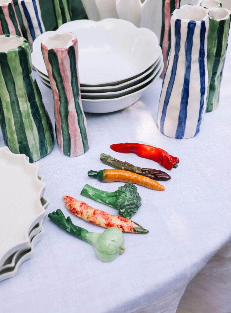 Blijf je lekker lang tafelen in de tuin? Met deze handbeschilderde besteksteuntjes uit Frankrijk leg je je mes en vork even op pauze – op een chique chilipeper, wortel, radijs of aubergine. Zo blijft je tafel mooi schoon én geef je je buitentafel net dat beetje extra flair.