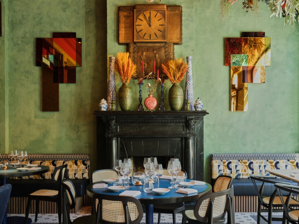 Het interieur is allesbehalve standaard: bordeauxrode plafonds, mintgroene muren, een statige schouw en kunst in lijsten zorgen voor een kleurrijke, bijna Parijse sfeer. Niet de klassieke Franse brasserie waar de eigenaren eerst aan dachten, maar juist iets eigens en verrassend. “Achteraf ben ik blij dat ze zo out of the box hebben gedacht,” vertelt mede-eigenaar Theor Verplancke. “Het voelt als Parijs in de jaren dertig – of misschien wel 2030.”