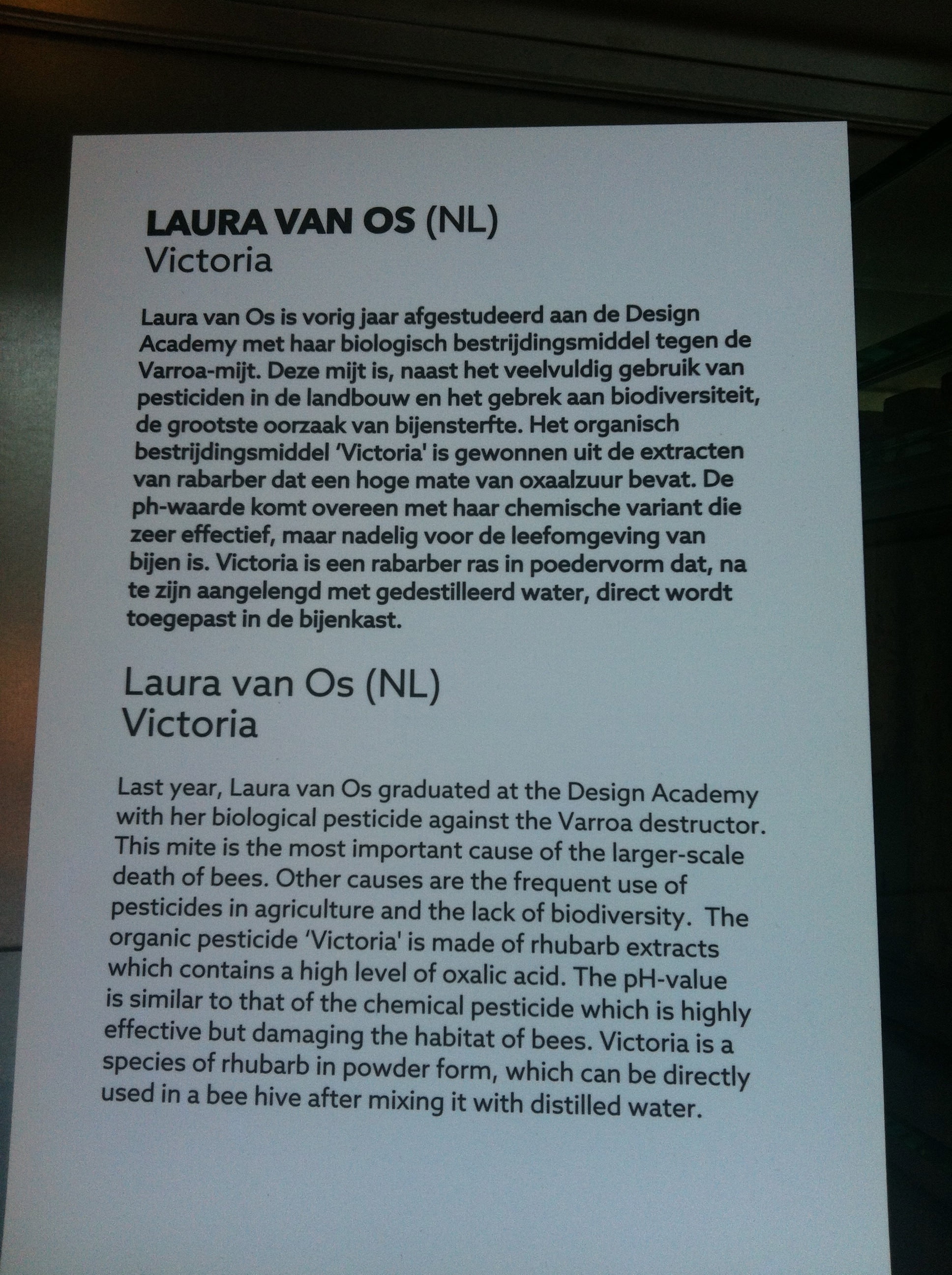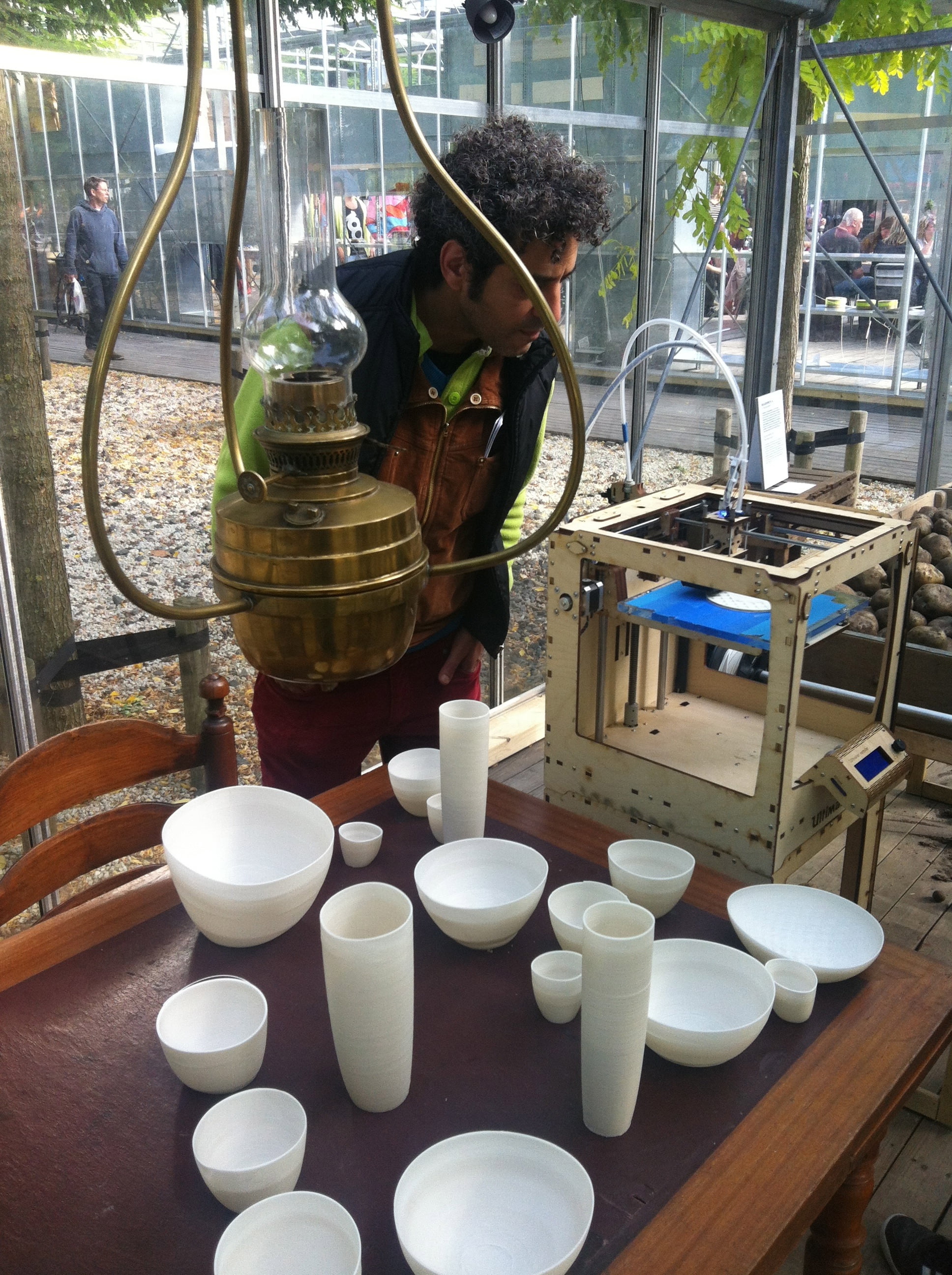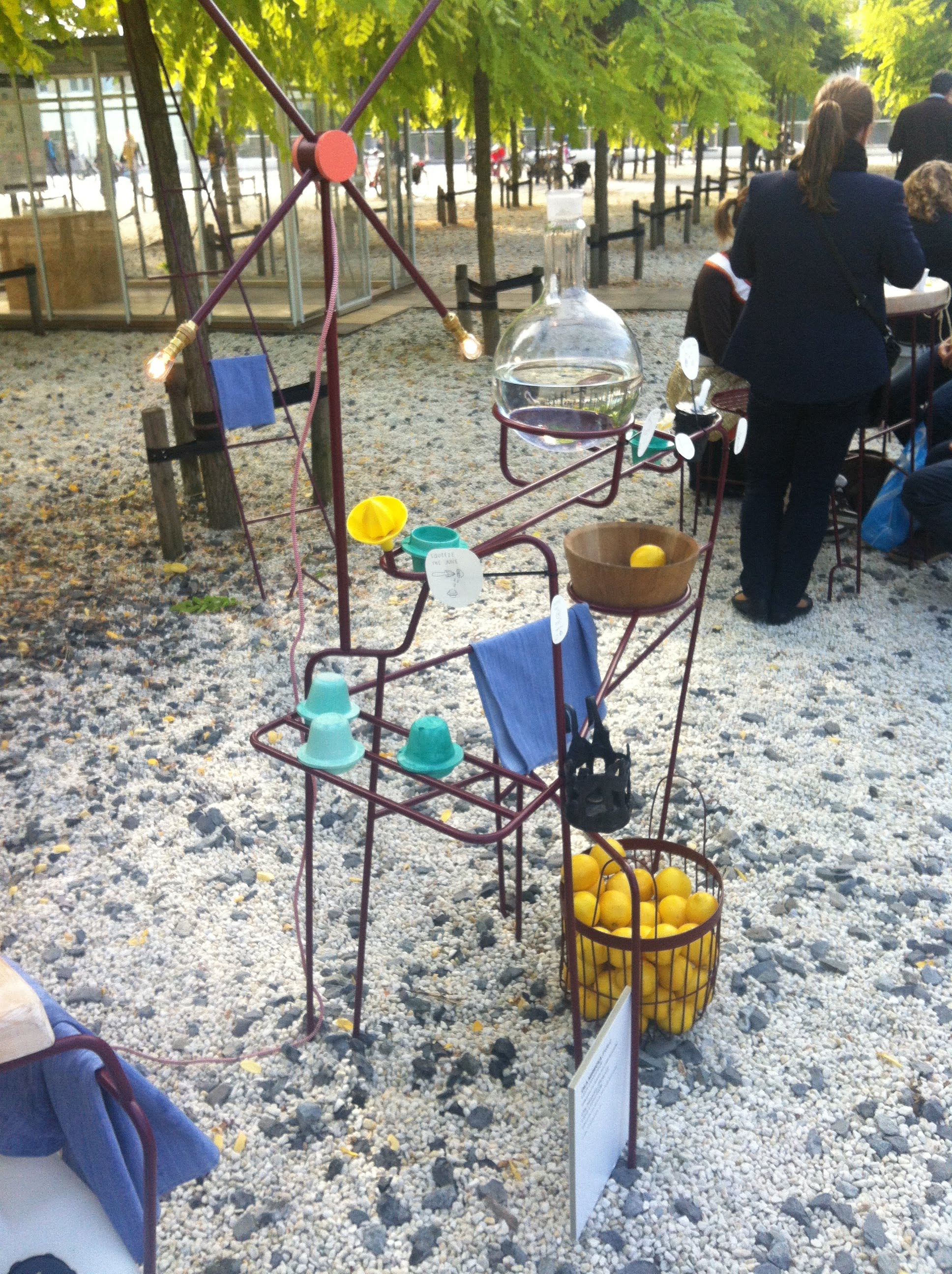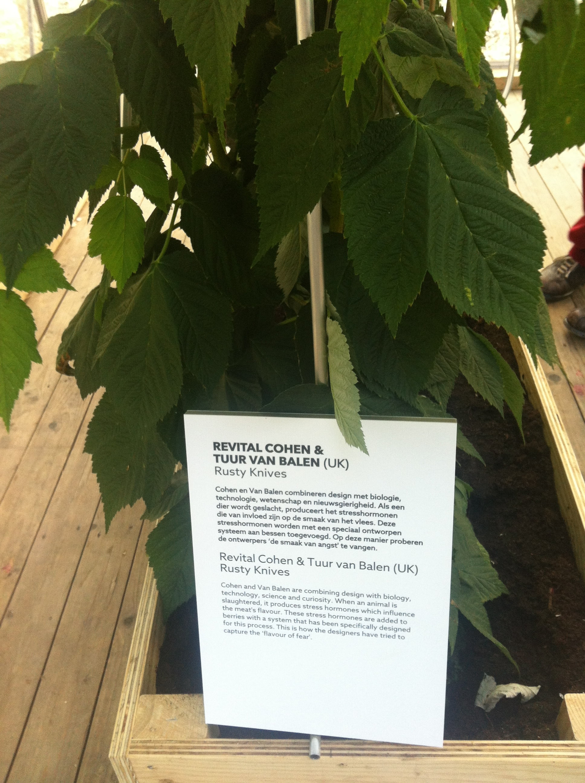 Buiten staat de leuke Poolse Ola Mirecka met haar speelse installatie om limonade te maken. Deze installatie doet mij denken aan Marije’s eigen werk. Ook de lekkere bakkerij van Karel Vlasblom (bakkerij Mama) en Piet Hekker (Bakkerswinkel) is het melden waard. Een heerlijk geurend huisje van brood. En de haast obscene frambozenstruiken die geïnjecteerd worden met het stresshormoon dat koeien bij slacht produceren: om de smaak van angst te vatten. Of het idee van The incredible shrinking man… een oplossing voor ons voedingsprobleem in de wereld? En wat te denken van het prachtige servies gemaakt in een 3D printer van aardappelafval? De nieuwe aardappeleters, met recht een Future Food House! Food for thought en een interessante andere kijk op eten. Teveel om op te noemen dus.