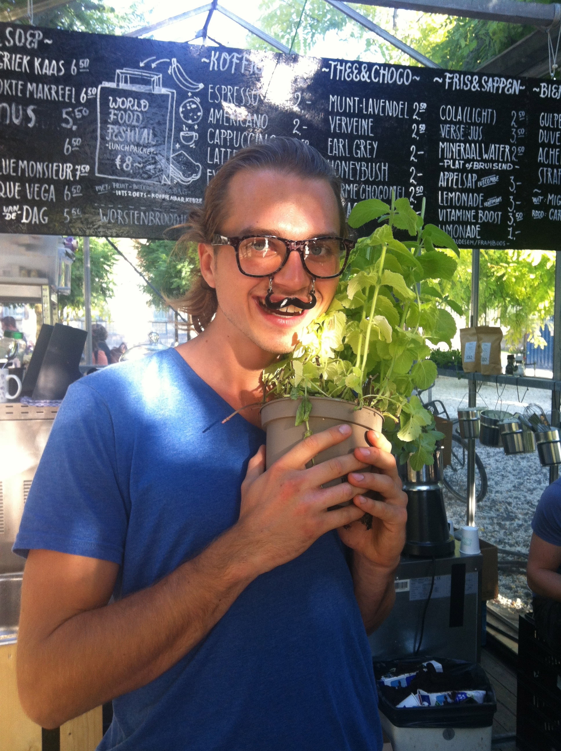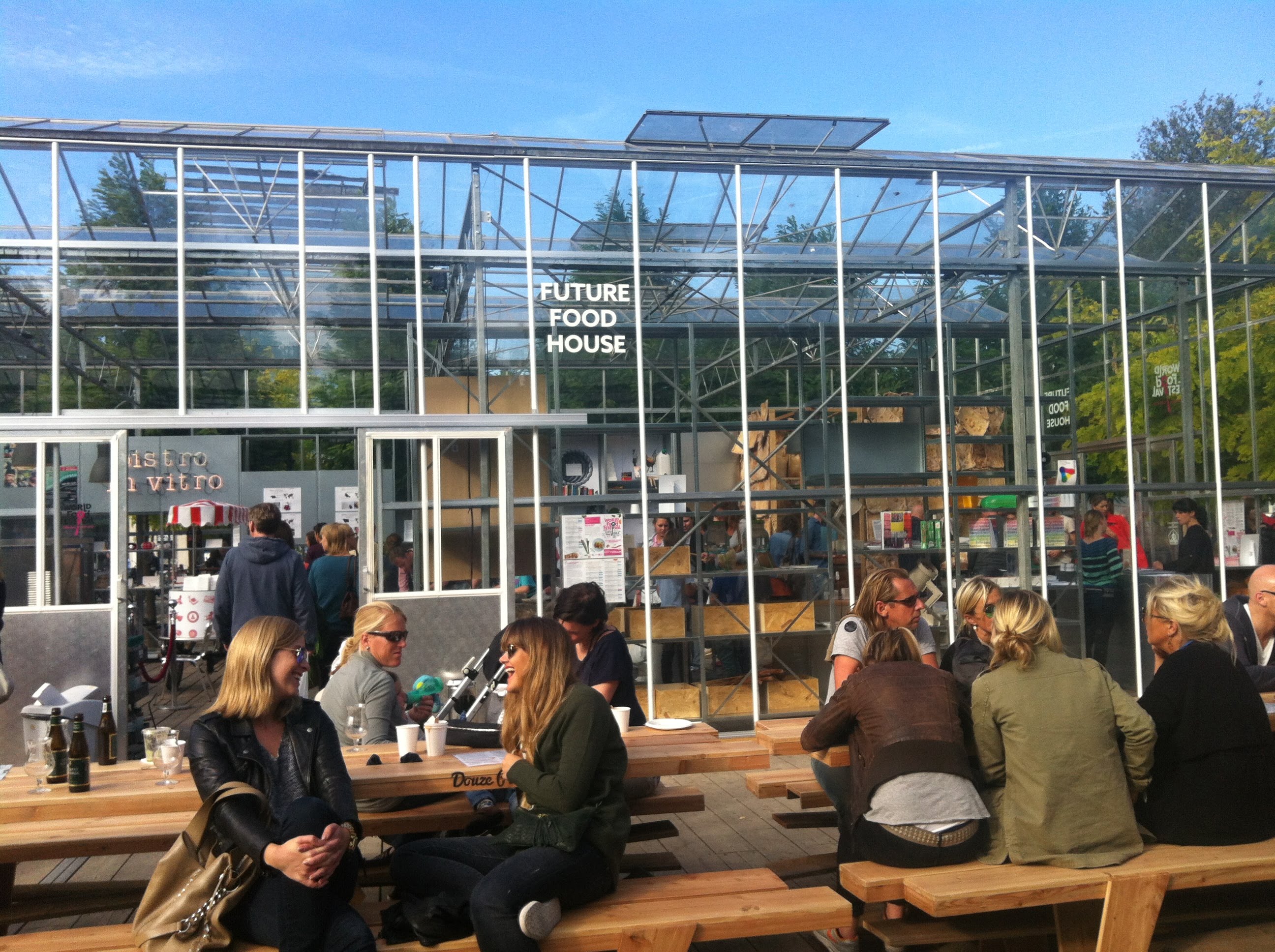 Merijn: ‘Het Future Food House op het World Food Festival in Rotterdam is door niemand minder dan Marije Vogelzang gecureerd; een dierbare vriendin en een geweldig inspirerende ontwerpster die eten als onderwerp van haar design heeft gemaakt. Ze noemt zichzelf eating designer i.p.v. food designer. Marije heeft goed om zich heen gekeken en verschillende andere collega’s met een wijdse blik op eten in de toekomst om zich heen verzameld. Dit alles in een mooie, transparante kas: dé blikvanger op het festivalterrein in het mooie museumpark in Rotterdam.