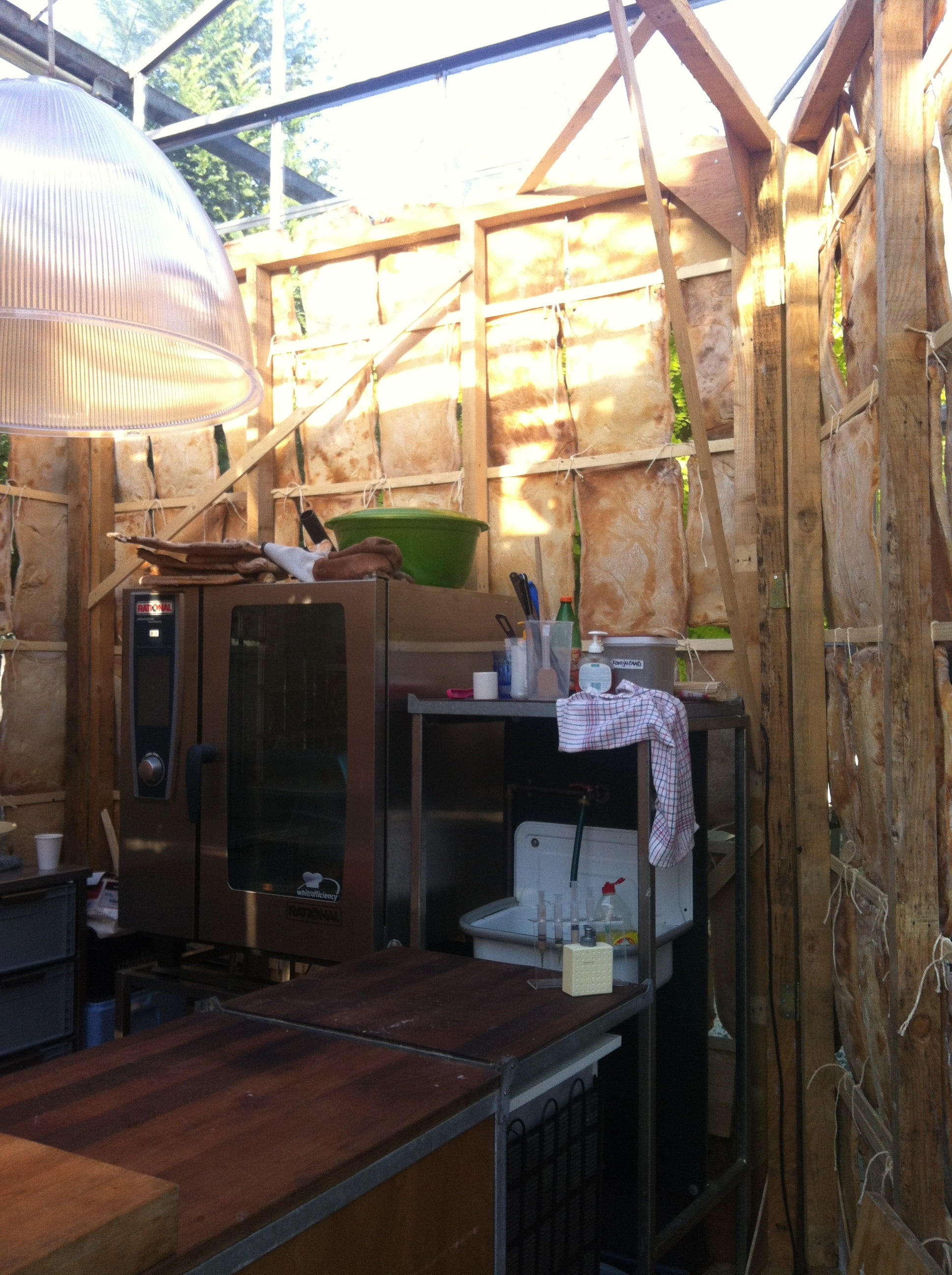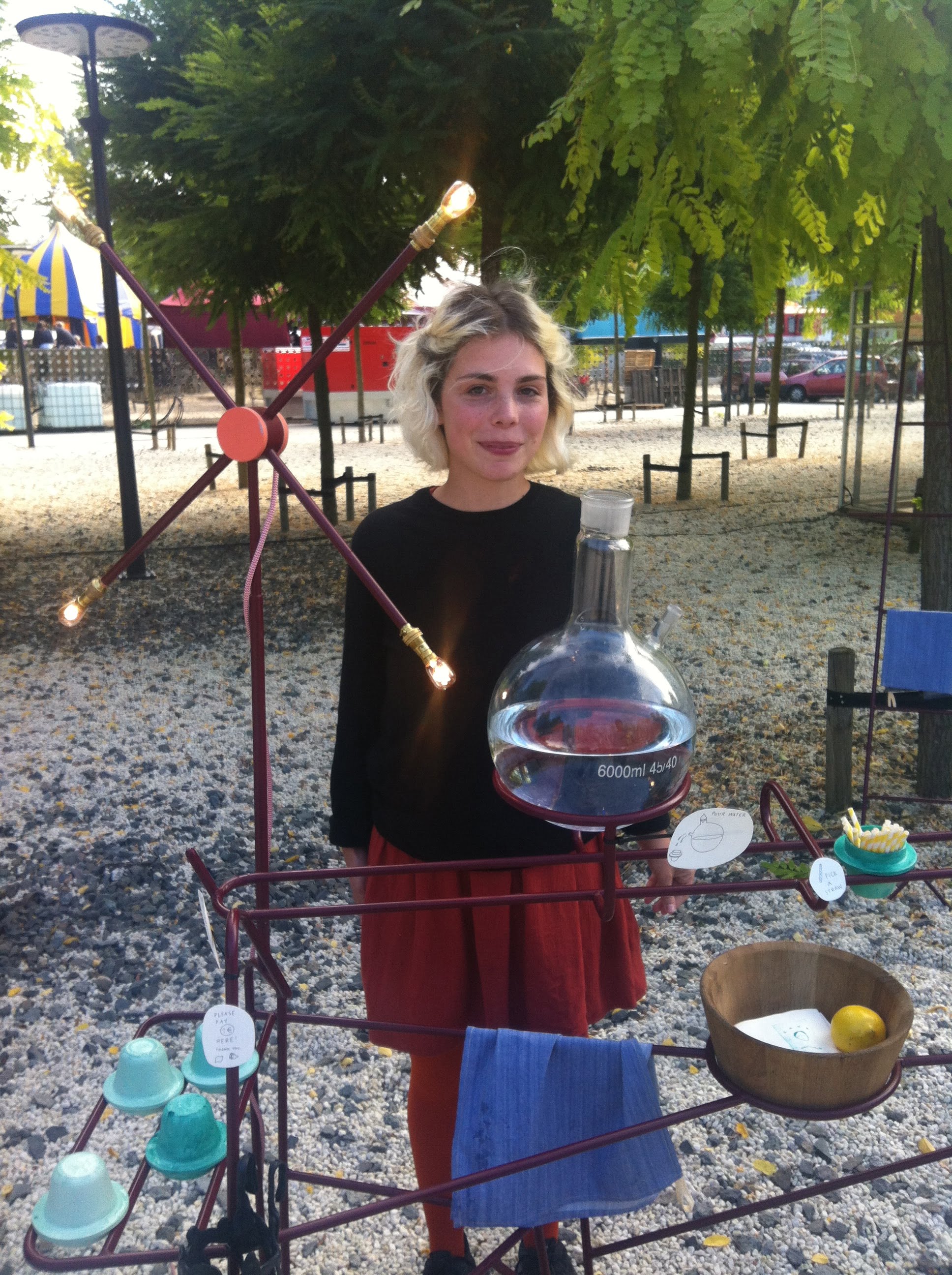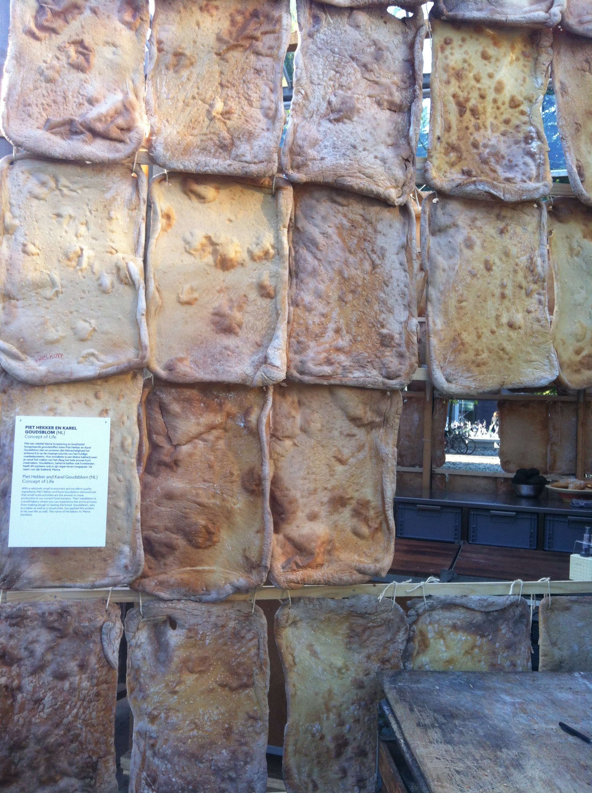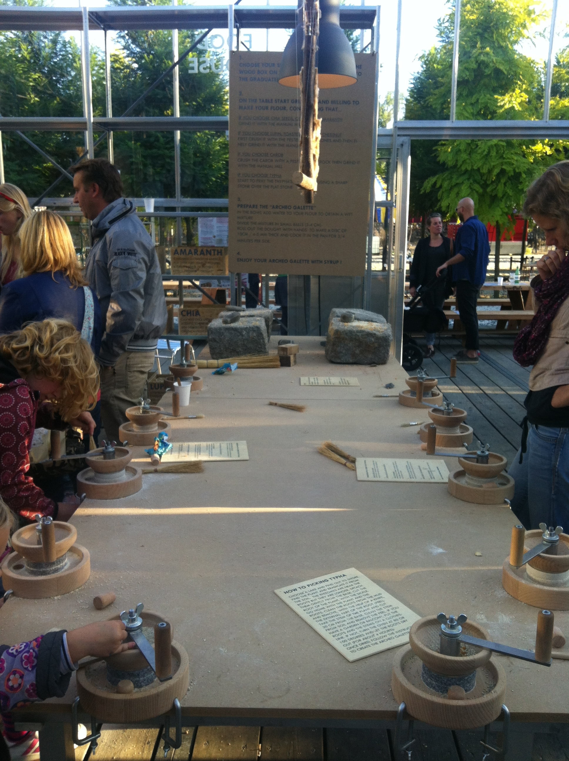 In de kas zag ik onder andere de installatie Archeo Mill van het Italiaanse collectief Arabeschi di Latte: een tafel vol houten graanmolentjes, grote massieve stenen (zoals uit de prehistorie), met daarbij kleine stenen als gereedschap. Je raadt het al: hier maal je granen. En dan bij voorkeur door kleine kinderhandjes. Kinderen vinden het maar wat leuk om amaranth, carob, kastanje, chia, quinoa en maïs te vermalen in de molentjes, of hard te slaan op een steen zodat de korreltjes verpulveren. En wat doen we dan met de granen? Naast de tafel staat een kookeiland waar van de vermalen granen kleine pannenkoekjes (archeo galette) met alleen maar water worden gemaakt en geserveerd met diverse soorten stroop.