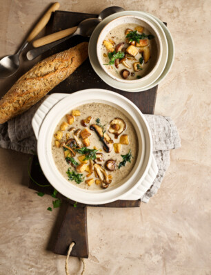 tofoe-paddenstoelensoep met tofoe-croutons