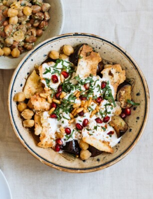 zoete-aardappelpuree met een crunchy kikkererwtentopping