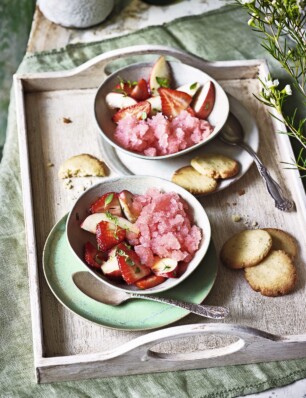 gestoomde meringues met ananasgranita en rum-butterscotchsaus