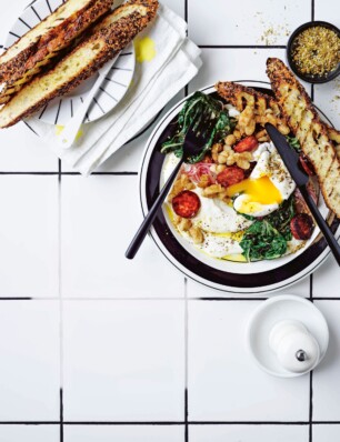 gepocheerde eieren met witte bonen, chorizo en geklopte ricotta