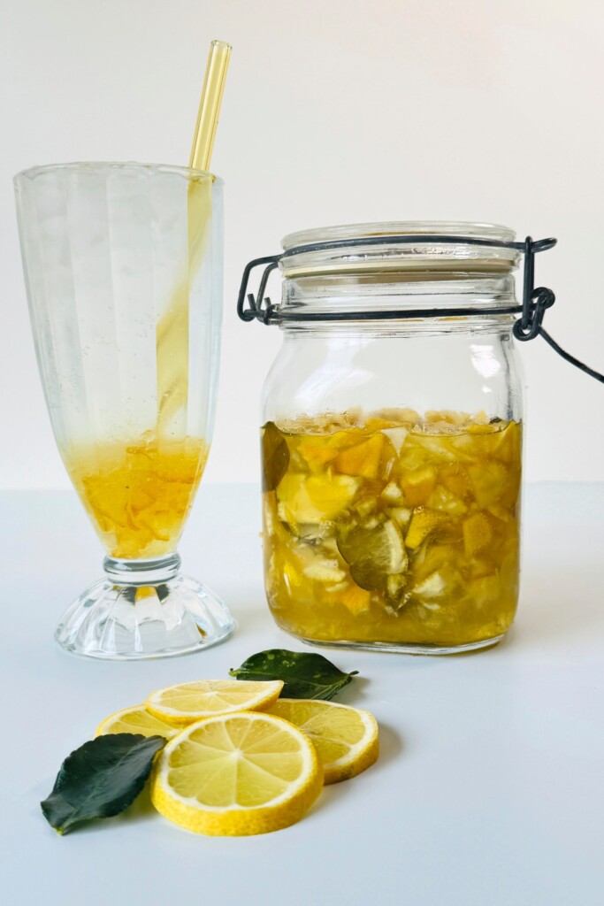 Dat zit ’m in het niet verhitten van de vloeistof waardoor je een hele pure, frisse smaak krijgt, die echt zo zalig is dat ik die nog niet bij andere zelfgemaakte siroop zo heb geproefd. De suiker lost langzaam op en neemt de smaak uit – in dit geval – de citroenen helemaal op.