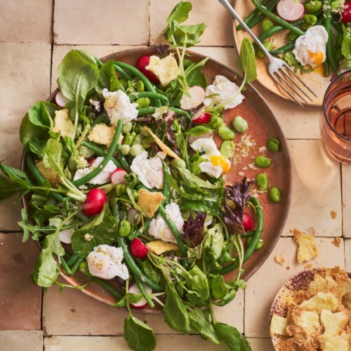 Deze salade is perfect voor een gezellige brunch of als fris bijgerecht op een zonnige dag. De gepocheerde kwarteleitjes vormen een heerlijke combinatie met de knapperige stukjes piadina en het romige, goudgele eigeel.