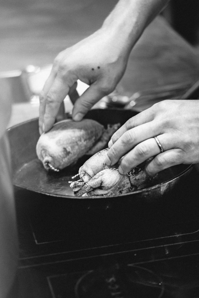 Het uitbenen is even een klusje: je begint bij de dijen en snijdt zo het hele karkas eruit door steeds met je mes een stukje verder langs het karkas te snijden.