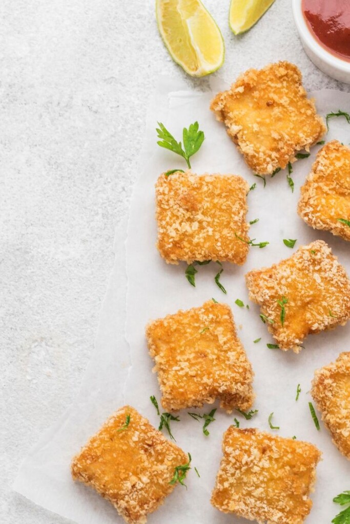 Tip 2: Wil je extra crunch, haal de blokjes dan vóór het bakken door een beetje maïzena (of bloem). Dit dunne laagje neemt vocht op en zorgt voor een fijne crispy bite, terwijl de binnenkant lekker zacht blijft. Ook een laagje edelgistvlokken kan wonderen doen – die gouden vlokjes geven zowel umami-smaak als een knapperig korstje doordat ze overtollig vocht absorberen.