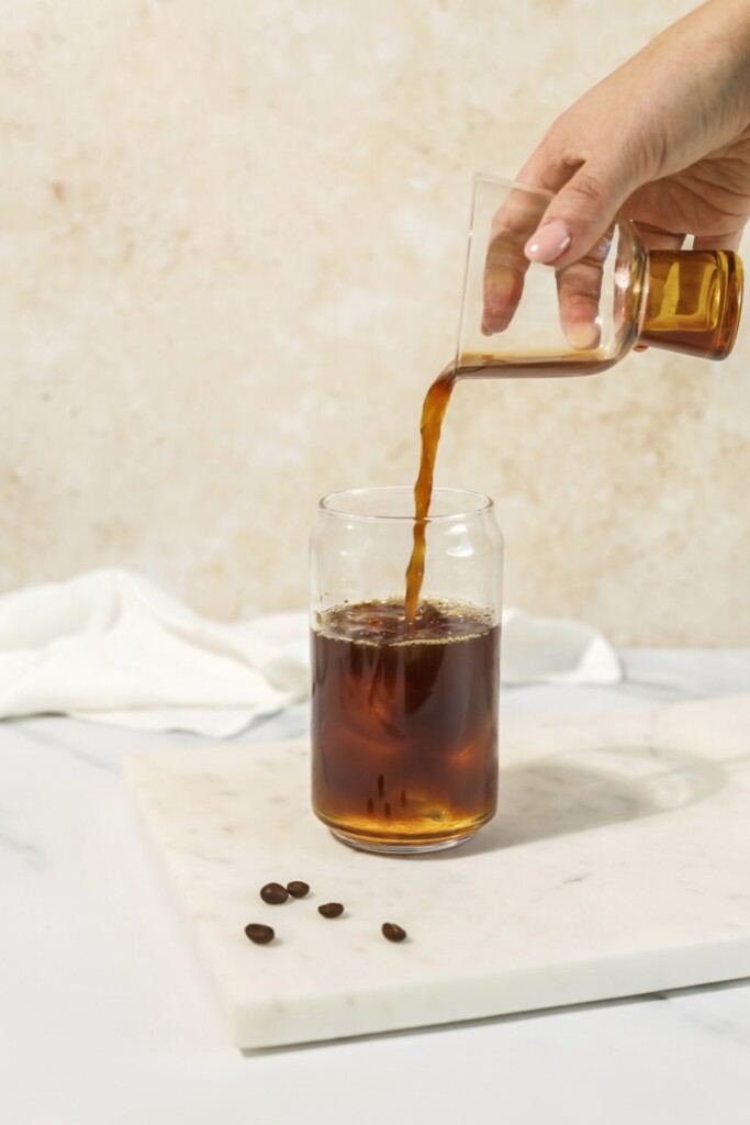 Het maken van cold brew kost vooral tijd en geduld. Je mengt grof gemalen koffie met koud water en laat dit mengsel vervolgens 18 tot 24 uur staan in de koelkast. Zo krijgt het water ruim de tijd om diep in de koffiekorrels door te dringen en de smaken eruit te halen. Het is belangrijk dat de koffie grof gemalen is. Dit voorkomt dat je straks fijne koffiedeeltjes in je drankje hebt en zorgt ervoor dat het water zich gelijkmatig kan verdelen in de koffiedeeltjes.