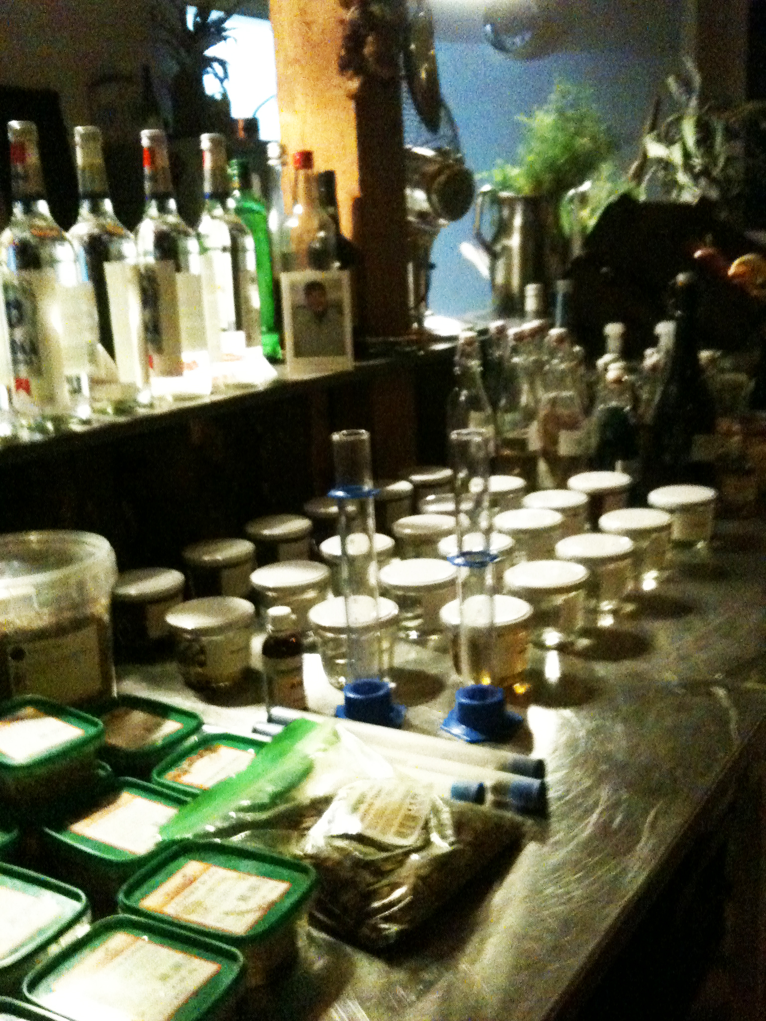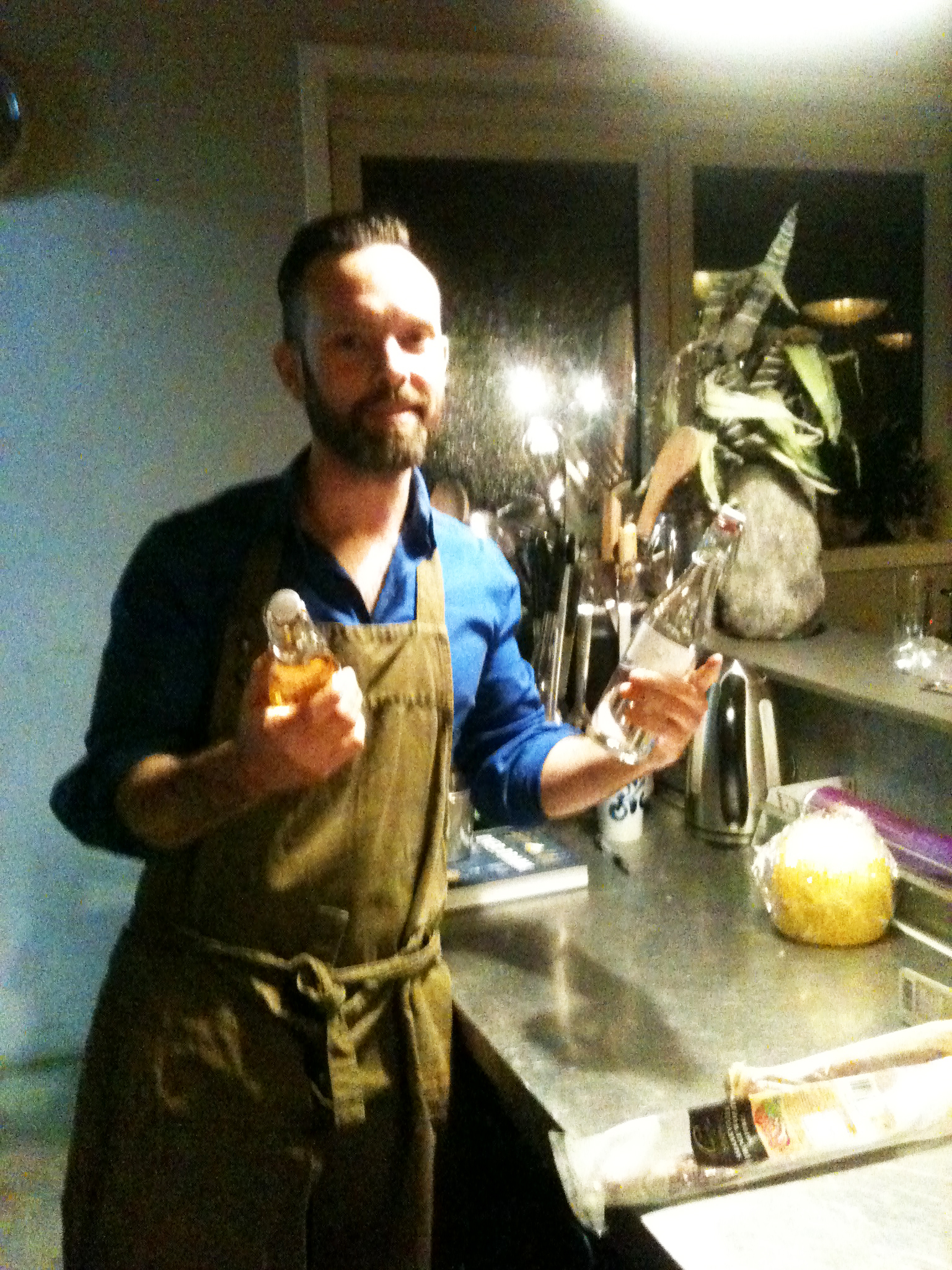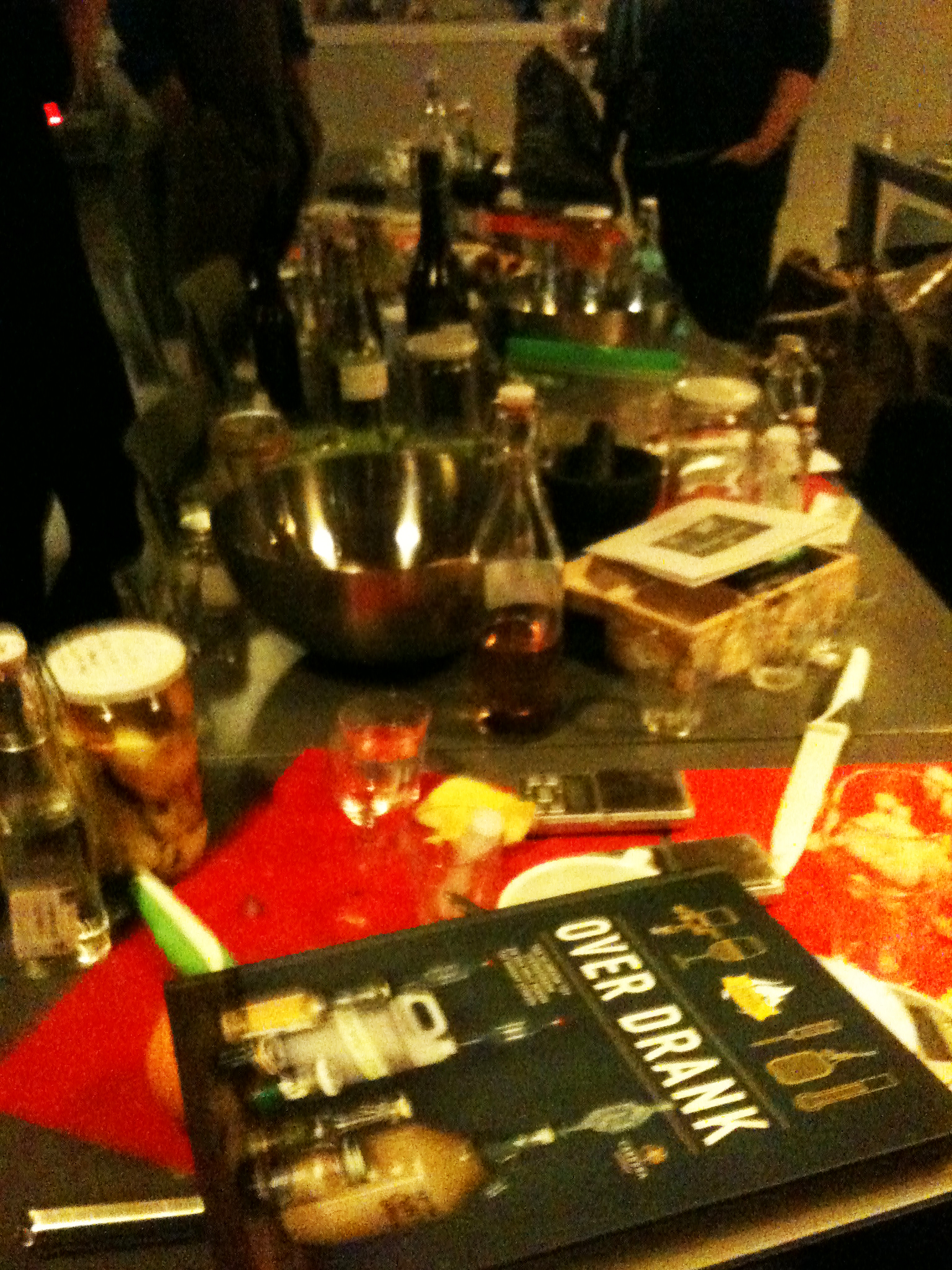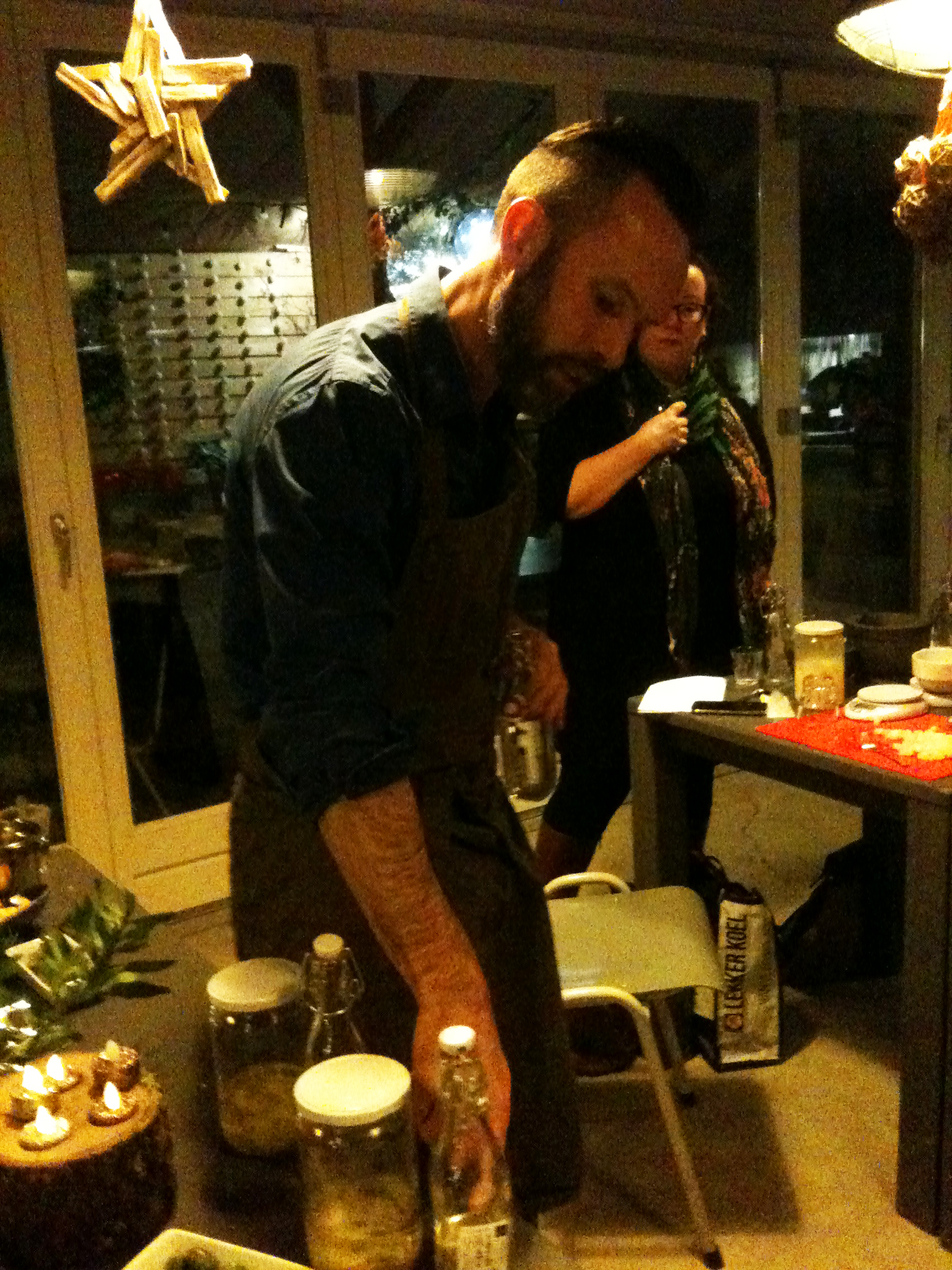 Ook zelf gin samenstellen is eigenlijk easy. Er gaan altijd jeneverbessen en koriander in, daarna volg je je eigen koers. Omdat het vanavond nogal snel moet, helpt Meneer Wateetons ons met esprits, gedistilleerde tincturen. Met een plastic spuit voegen we shots van 0,5 ml esprits toe. Ik kies steranijs, vanille, limoenblad, zwarte peper voor wat pep en engelwortel, het wordt tenslotte kerst. Dit resultaat is direct klaar voor gebruik dus proeven en vergelijken we er 7. Grappig dat ieders gin opvallend anders smaakt. Stiekem vind ik die van een ander een tikje lekkerder en voeg daarom nog snel een spuitje hibiscus toe. Nu is ook mijn gin perfect. Heel tof zo’n experiment en vooral zeer aanstekelijk. Geen kerstplannen? Haal dat boek Over drank en doe het lekker zelf! Meneer Wateetons geeft ons nog een lepeltje homemade advocaat, die echt niet te vergelijken valt met dat spul uit de winkel, zo vers en lekker! Ook dat recept staat in zijn boek. Proost en fijne feestjes!’