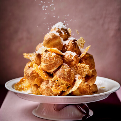 Typisch Dosia: niet een zoet soezenrecept, maar een hartige variant. En dan niet zomaar op een schaaltje, maar op elkaar gestapeld tot een imposante soezentoren, aka de ‘croquembouche’. Wie ooit MasterChef heeft gekeken, weet hoe uitdagend zo’n toren is voor veel bakkers.