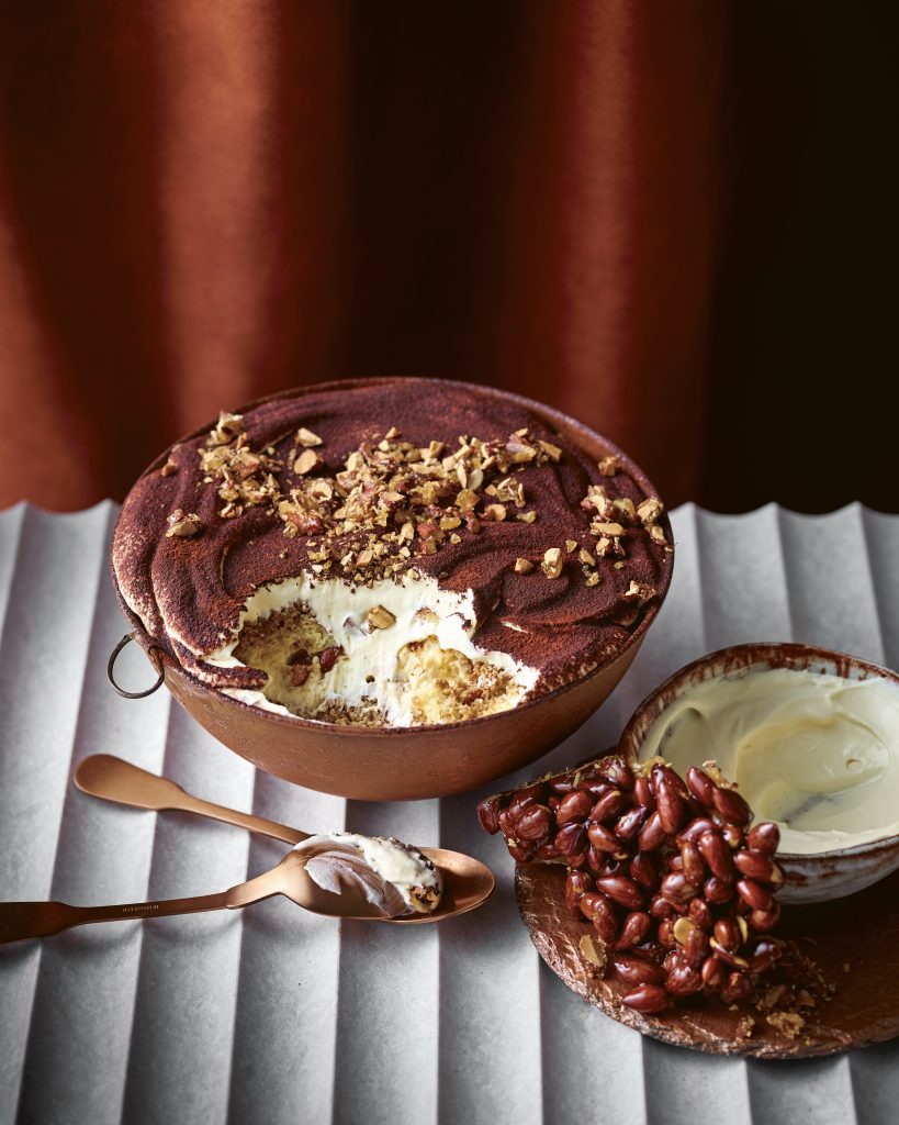 Dit heeft geen introductie nodig, toch? Geniet van romige laagjes, zelfgebakken lange vingers, koffie, chocolade en noten plus drankjes in de toet der toeten.