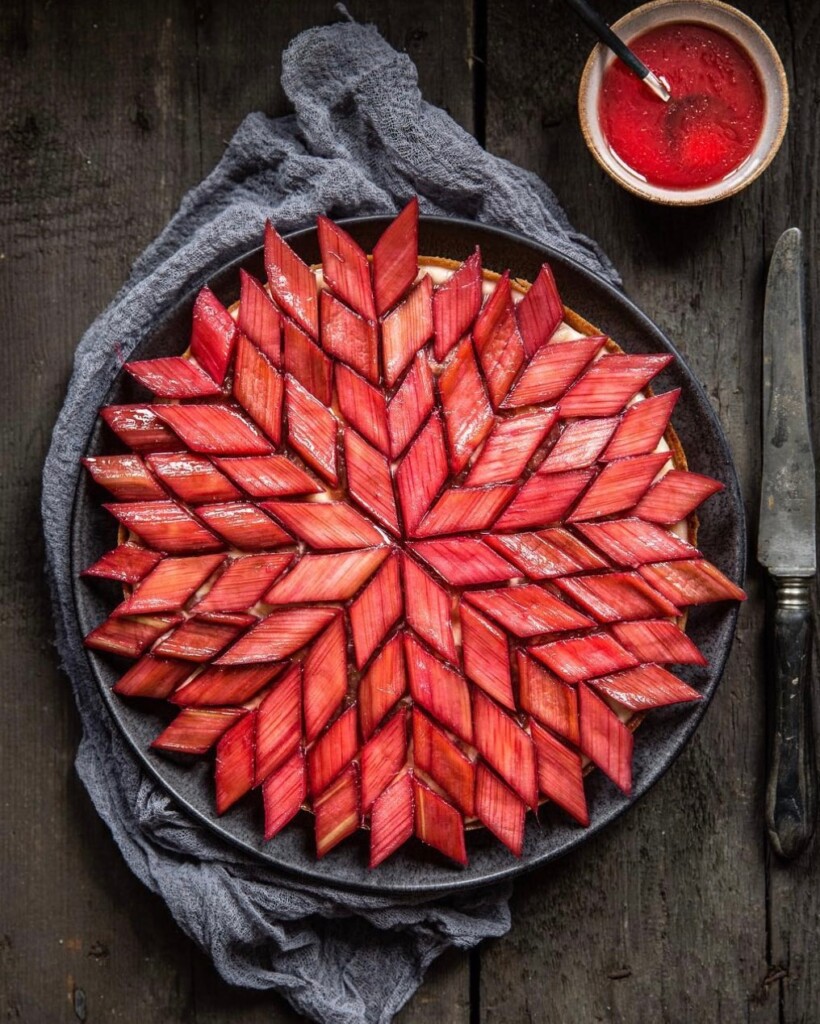 • Bestrijk de rabarber eventueel met een dun laagje abrikozenjam of suikersiroop voor glans.
