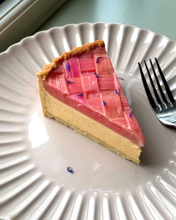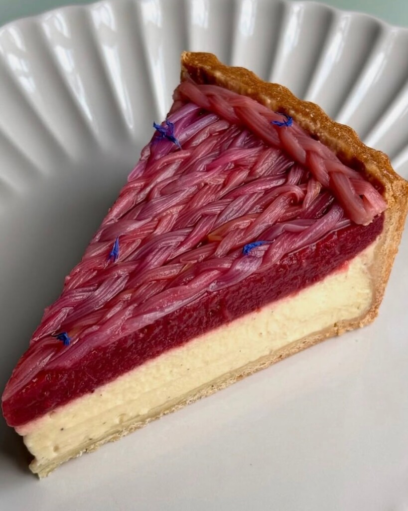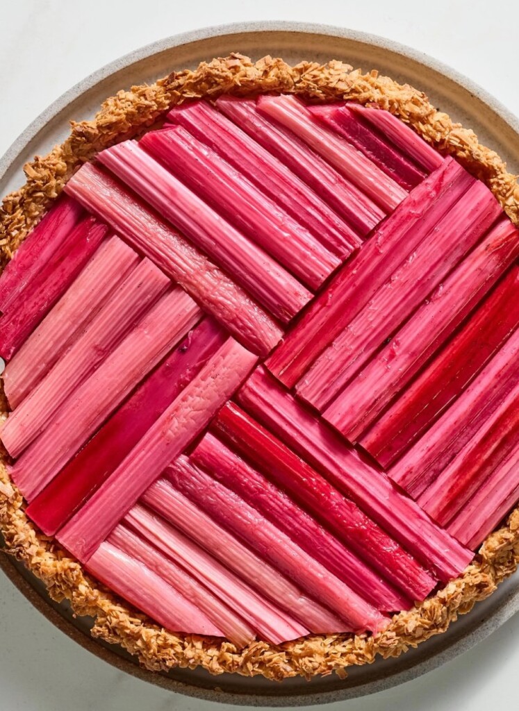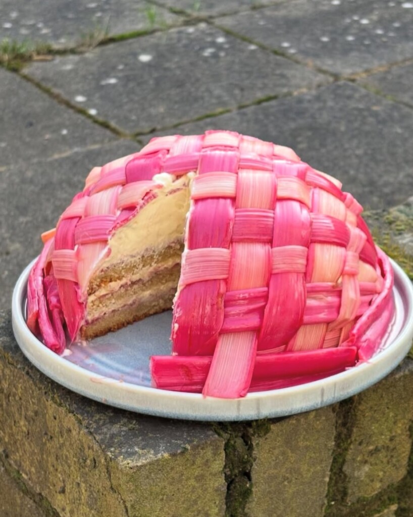 Een vlecht van rabarber is mooi langs de zijkant of midden op de cake, of ga voor heel veel kleine vlechtjes.