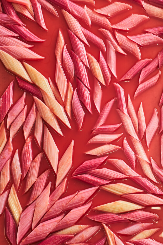 2. Blancheer de rabarber kort (15–30 seconden in kokend water, dan direct in ijswater) om het buigzaam te maken zonder dat het uit elkaar valt. Nog lekkerder is om de rabarber in hete siroop te laten afkoelen, zodat de smaak van de siroop in de zure stengels trekt.