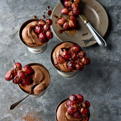 naar receptOp drie: chocolademousse met gekaramelliseerde balsamico-druiven