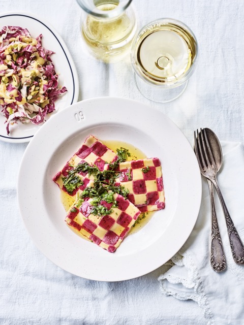 Het menu van Liselore staat voor verwennerij. Vooraf serveert ze pompoen met gemarineerde burrata, dan haar mooie ruitjesravioli en toe croissant-ijs met chocosaus.