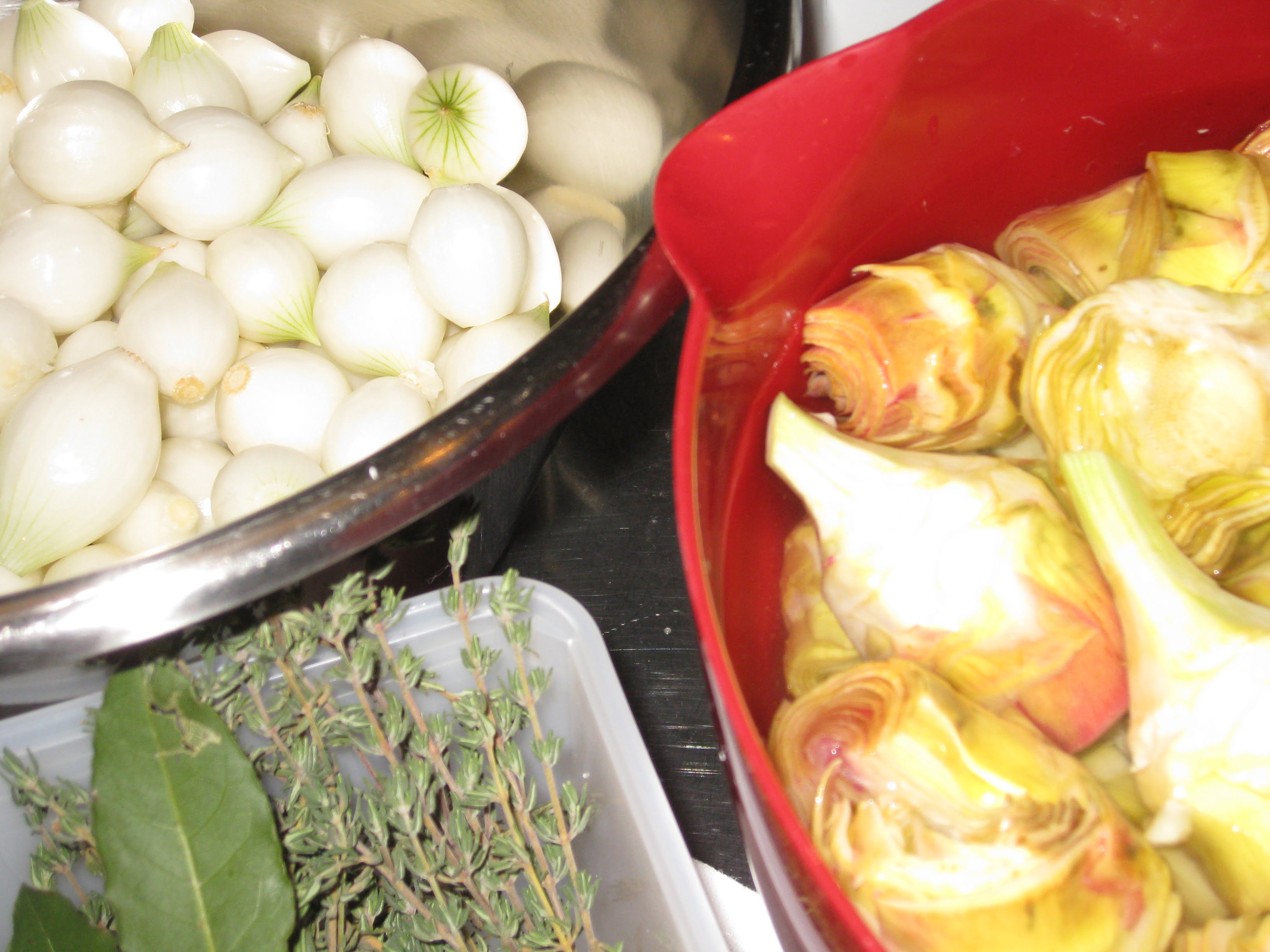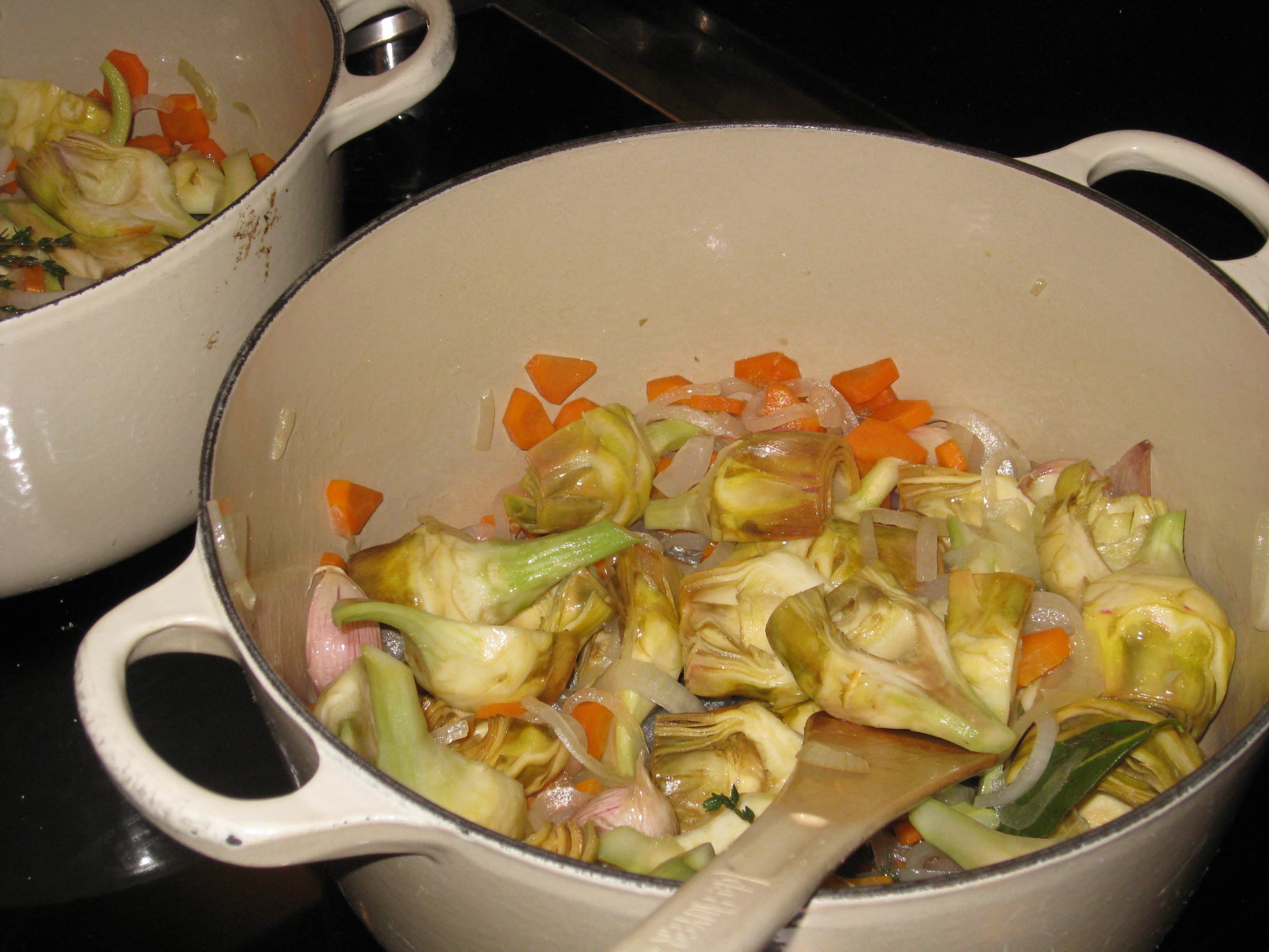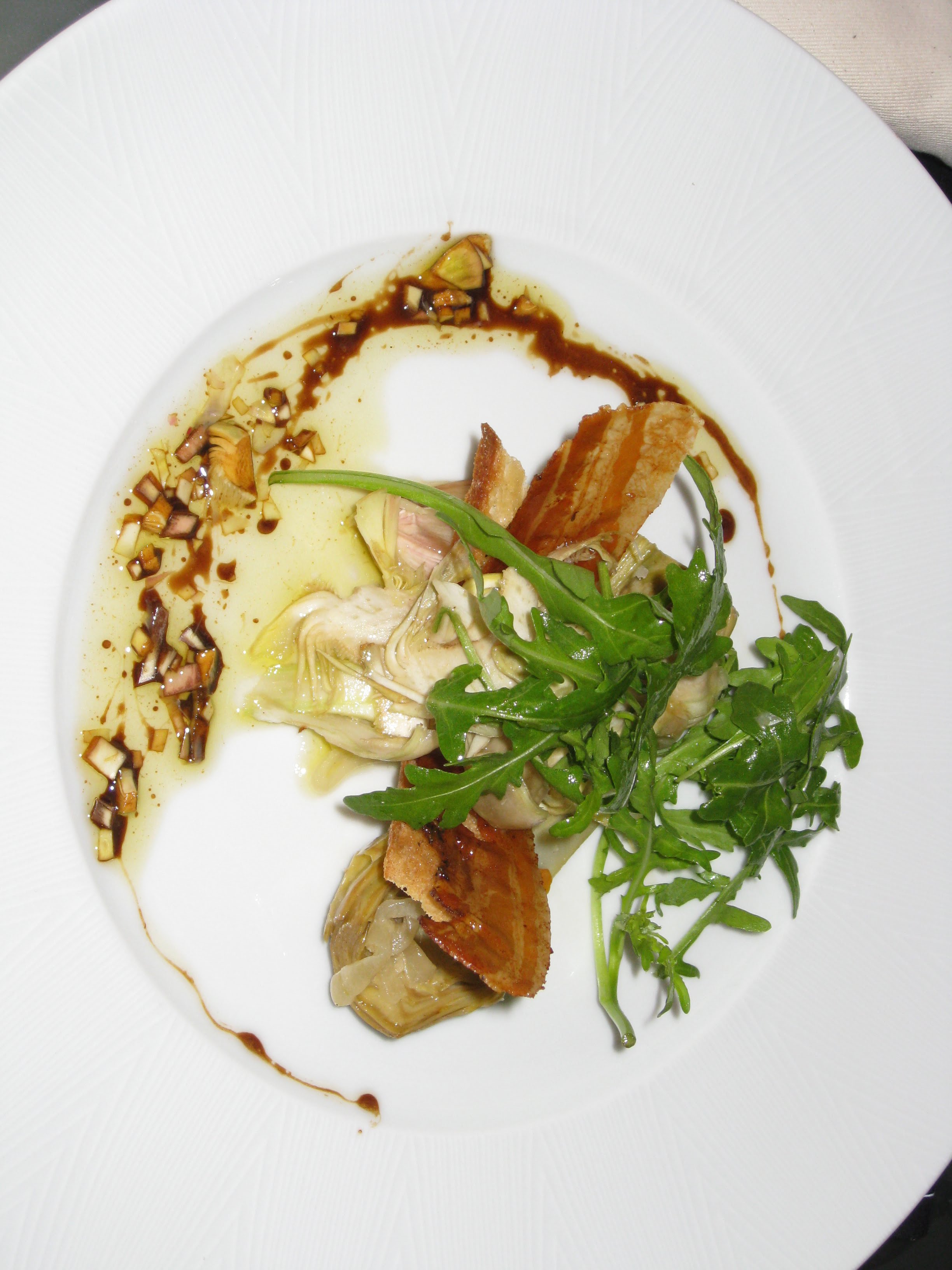 Pierre leert ons artisjokken schoonmaken, en dat is een kunst op zich! De buitenste blaadjes moeten we eraf knakken – zo klinkt het precies – tot je licht groengeel mals blad ziet. De onderkant van de vrucht en de steel schillen we en daarna snijd je het bovenste 1/3 deel van de artisjok af en halveer je ze. Dan neemt Pierre zo’n lepeltje waarmee je boterbolletjes maakt en haalt het harige hart er in één keer uit. Wat handig! Hij dompelt de mini-artisjokken in een schaal water met sap van een citroen. We smoren de uitgelekte artisjokjes in olijfolie samen met fijngesneden witte ui en brunoise van wortels (in miniblokjes), hele tenen ongepelde knoflook (!), met verse peper en zout, tijm, laurierblad en een flink glas wijn erbij, laten het inkoken en gieten er dan de bouillon over en laten het stoven tot ze gaar maar nog wel stevig zijn. We halen ze uit de pan, nemen de kruiden eruit en laten de saus inkoken. Dat inkoken is van belang, het kost tijd maar geeft zo’n intense smaak dat ik ook daar thuis meer geduld voor moet inbouwen. Een deel van de artisjokken schaven we met de mandoline tot superdunne plakjes, de afsnijdsels gaan fijngesneden in balsamico-azijn met wat olijfolie, wat later wordt gebruikt als dressing. We schikken alles op borden met rucola, de harde spekplakjes en doen er wat saus over en de dressing ernaast.