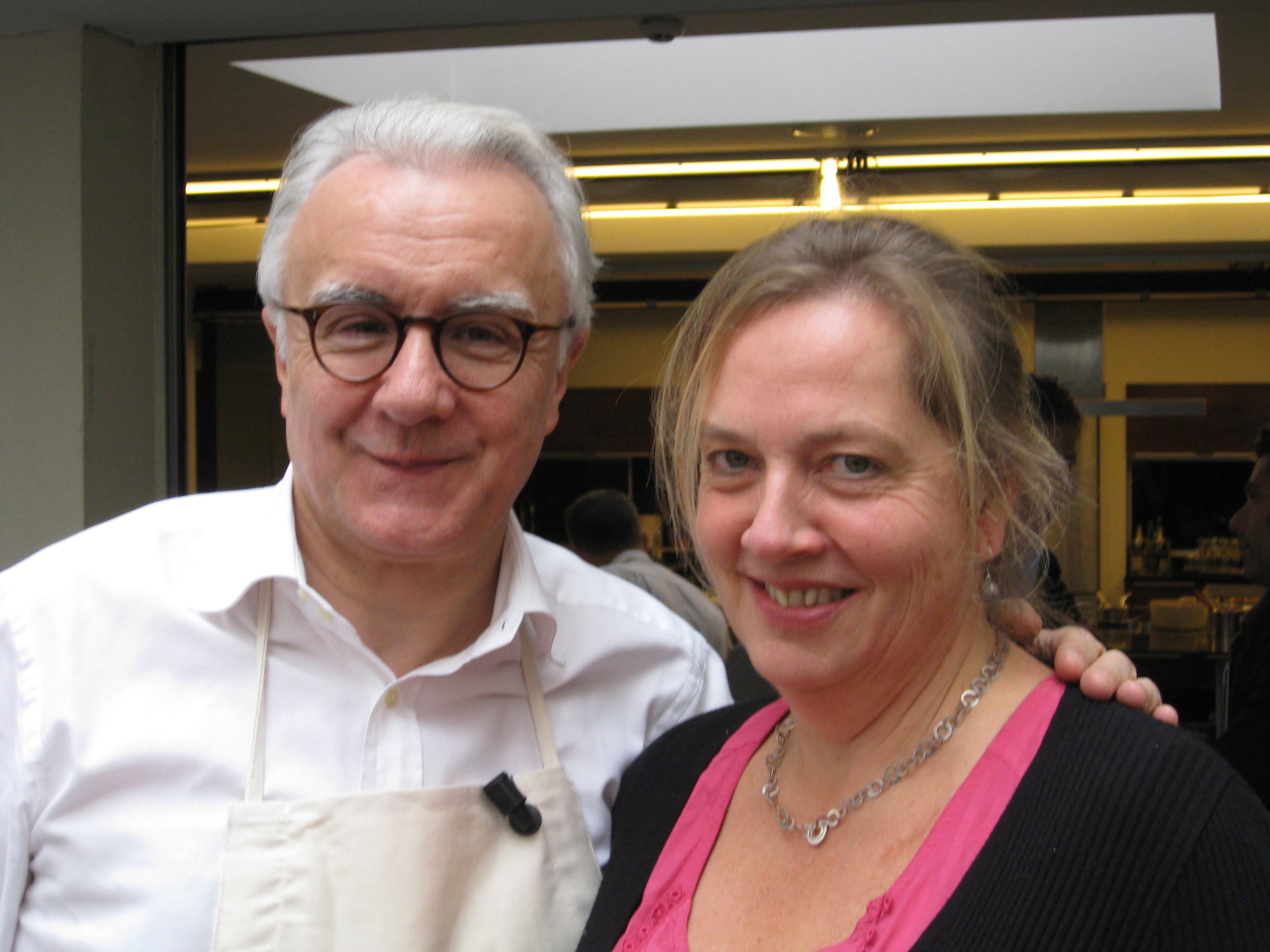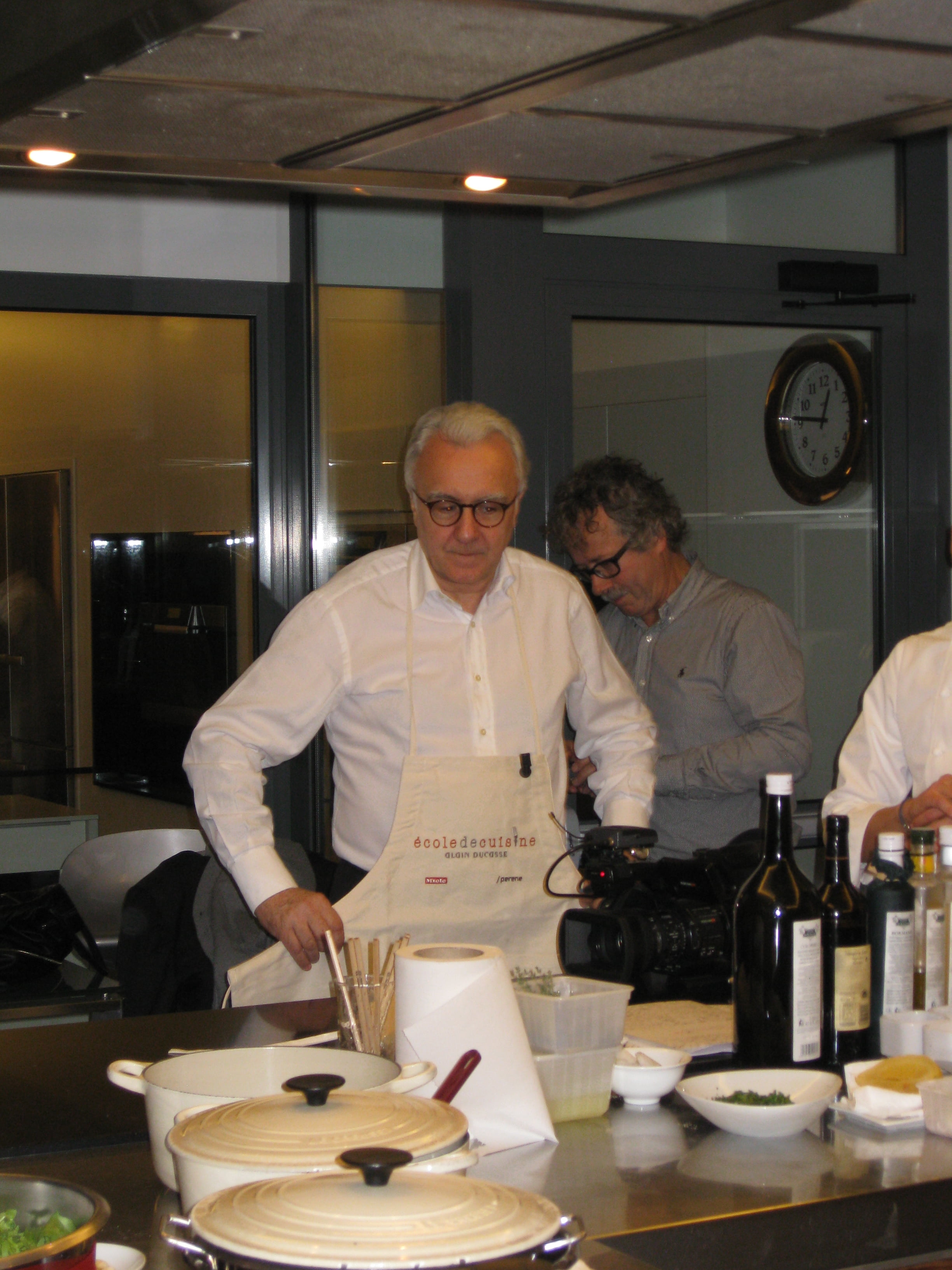 Klaar om te serveren als voorgerechtje aan Alain Duscasse die nu zelf is gearriveerd. De spanning stijgt. Het personeel van de kookschool staat op scherp, alles móet perfect zijn, en iedereen is pas gerust als Alain Ducasse met een glimlach zijn goedkeurig geeft aan dit bescheiden voorgerecht. Hij praat, leegt zijn champagneglas en gaat aan tafel, neemt een hap. Wij ’cursisten’ proeven ook en vinden het goddelijk. En hij? Hij glimlacht! Het is goed, met wat aandacht kan iedereen dit koken, met goedkeuring van de grootmeester.