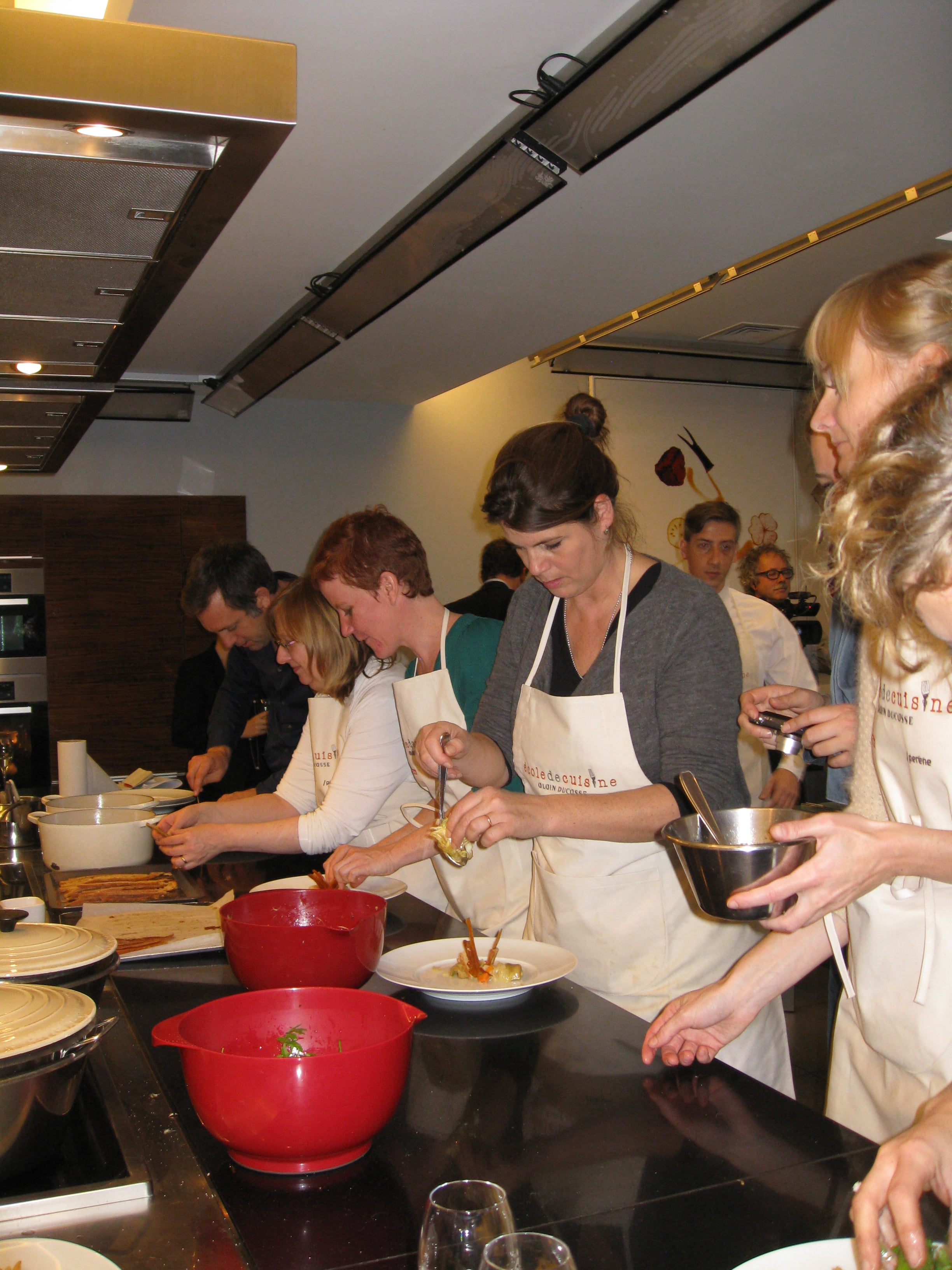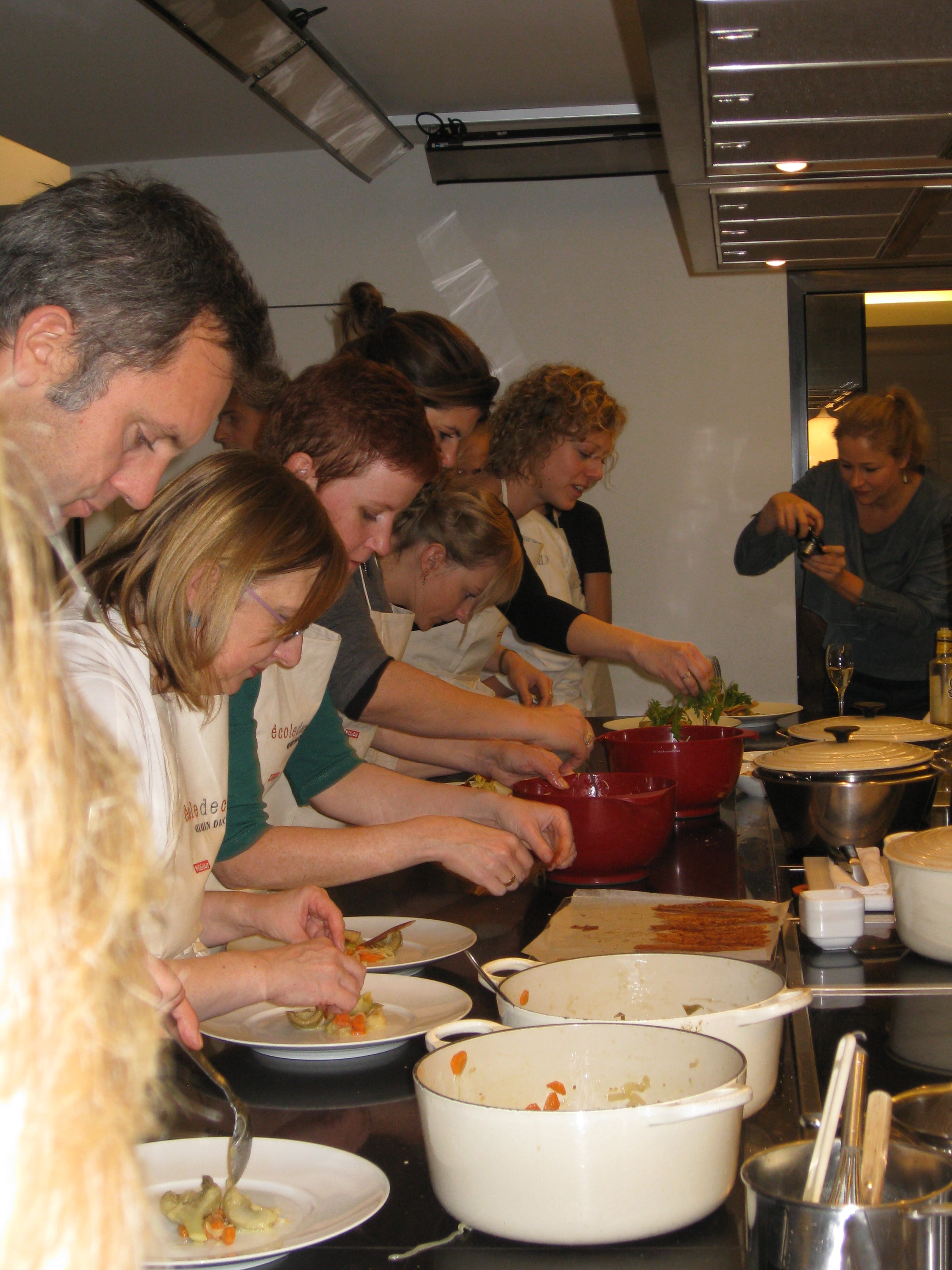 Aan de buitenkant niet opvallend, maar binnen is deze kookschool ultramodern met vier professionele designkeukens en een royale serre. Perfecte apparatuur, mooie pannen. Maar vooral fijn zijn de aardige en kundige chefs die in rap Frans en redelijk Engels heel bevlogen hun vakkennis met je delen. Pierre Morat – een jonge, slimme chef – doet artisjokken barigoule uit de doeken.