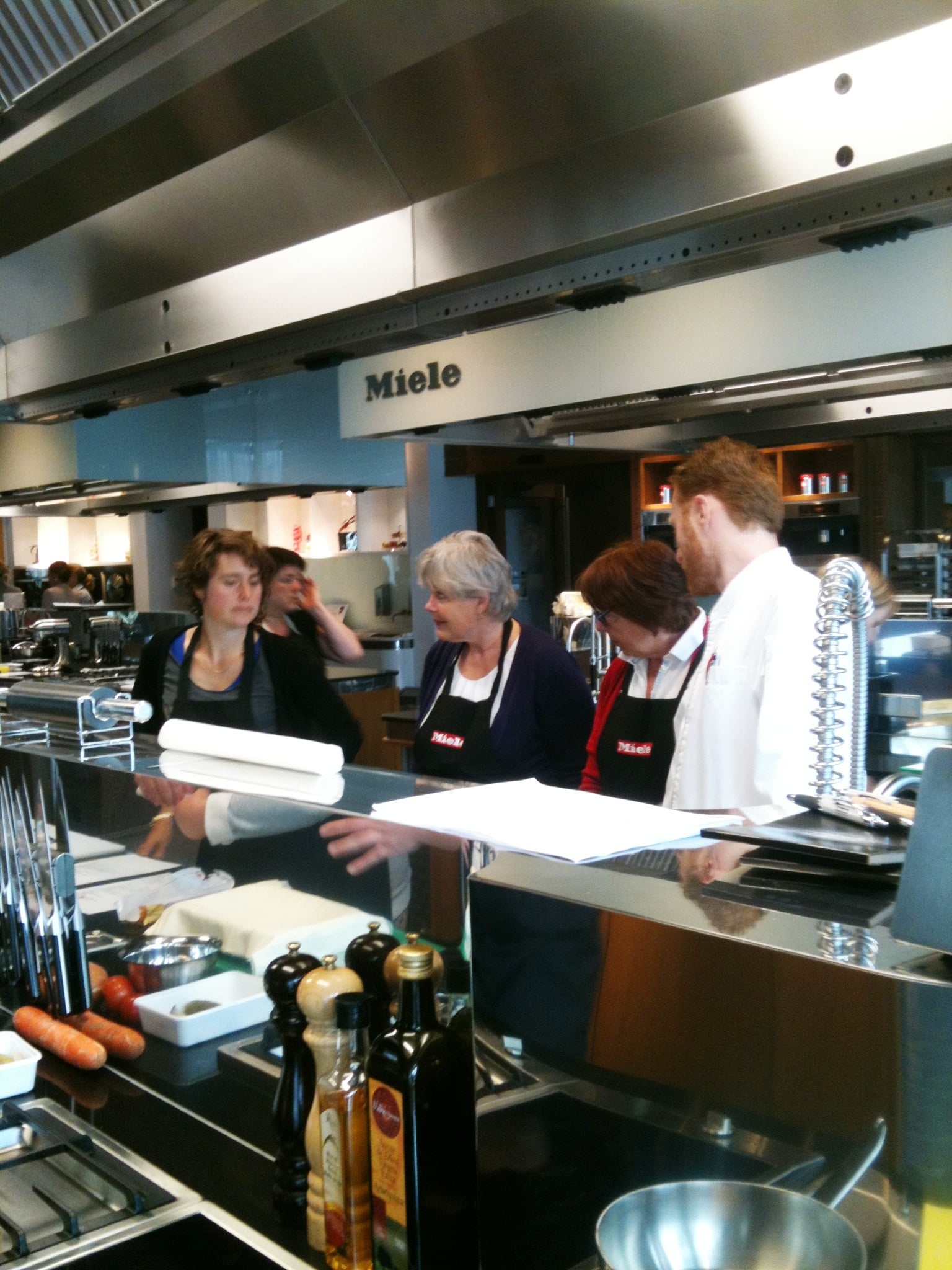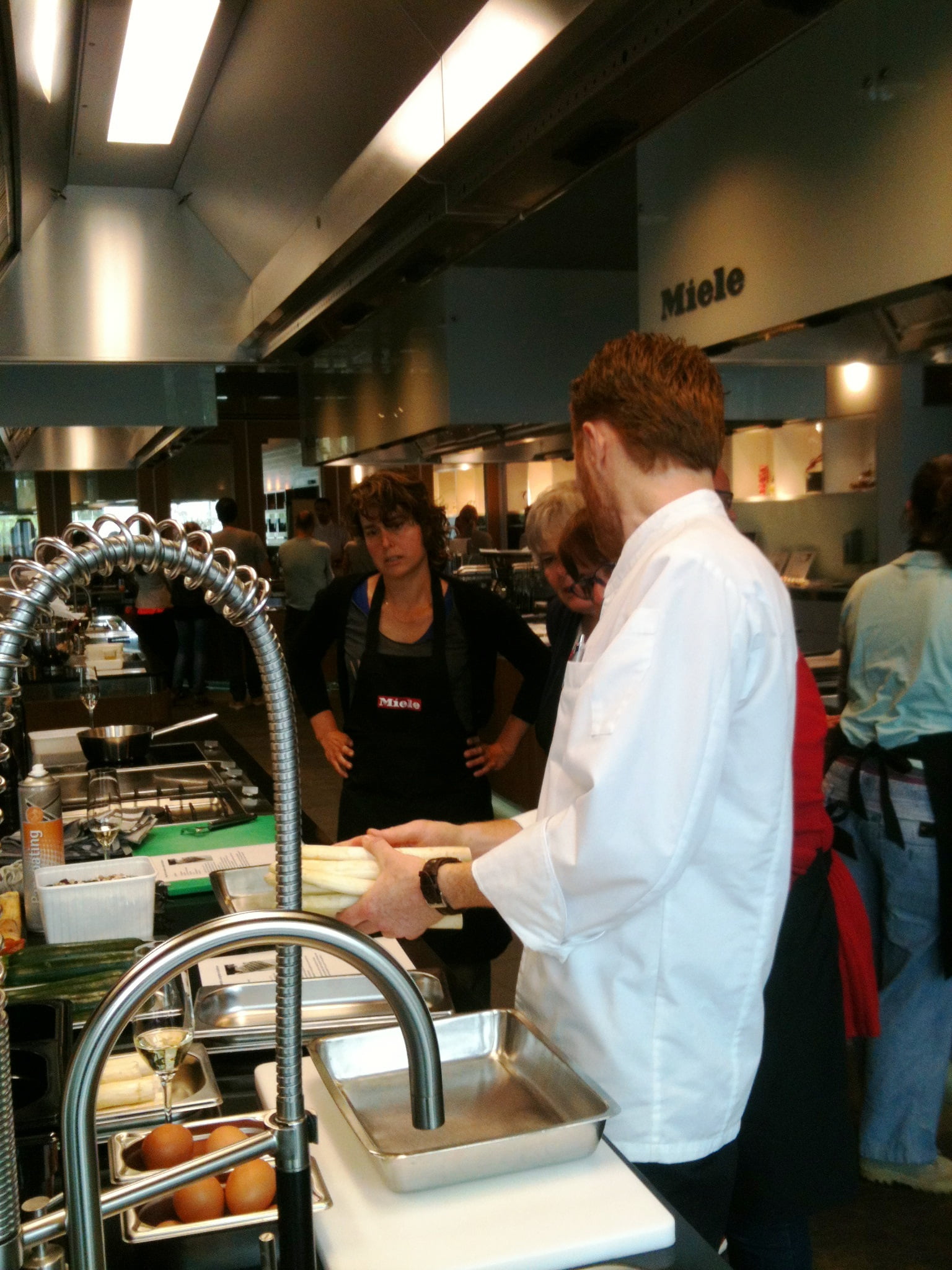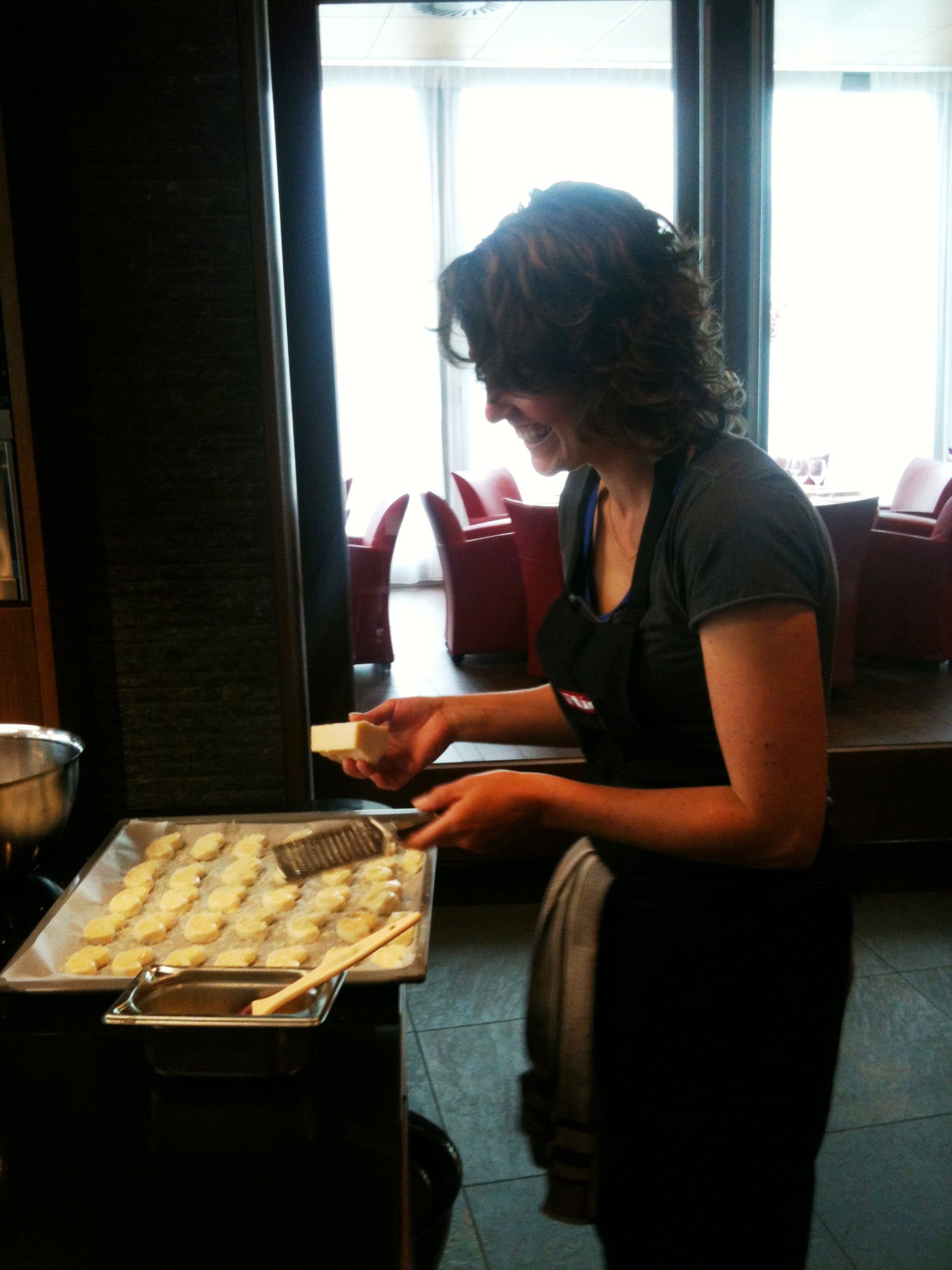 Laura: ‘Direct na de koffie willen de deelnemers aan de slag, want het lijkt lang zo’n dag bakken, maar tijd vliegt voor leergierigen. Efficiënt ingedeeld in groepen, in geweldig uitgeruste keukens, volgt de eerste uitleg. Mijn collega Marion gaat brood bakken en ik begin met ’n hartige bladerdeegtaart van asperges, courgette en basilicum. Het bladerdeeg is kant-en-klaar, dus kunnen we ons goed op de taartvulling storten. Een stoomoven is nu heel handig, want de groenten zijn snel bijna gaar en kunnen om en om in de bakvorm op het blind voorgebakken bladerdeeg. Met een mengsel van eieren, room en verse basilicum en veel peper gaat de taart nog een half uurtje de oven in. Afgekoeld geproefd mis ik nog wat zouts als spek of ansjovis, maar het is een leuk basisrecept. Dan volgen van Tante Fanny bladerdeeg tussendoor nog kaasvlinders en zoete kaneelkoekjes en maken de bakburen een oosterse kippastei en – heel lekkere – millefeuille van krokant filodeeg met rood fruit en citroentijm-crème die er royaal uitziet door de meerdere laagjes. We vergelijken de resultaten (lachend hoor, want dit is gelukkig géén wedstrijd!), proeven elkaars baksels en delen de technieken.’