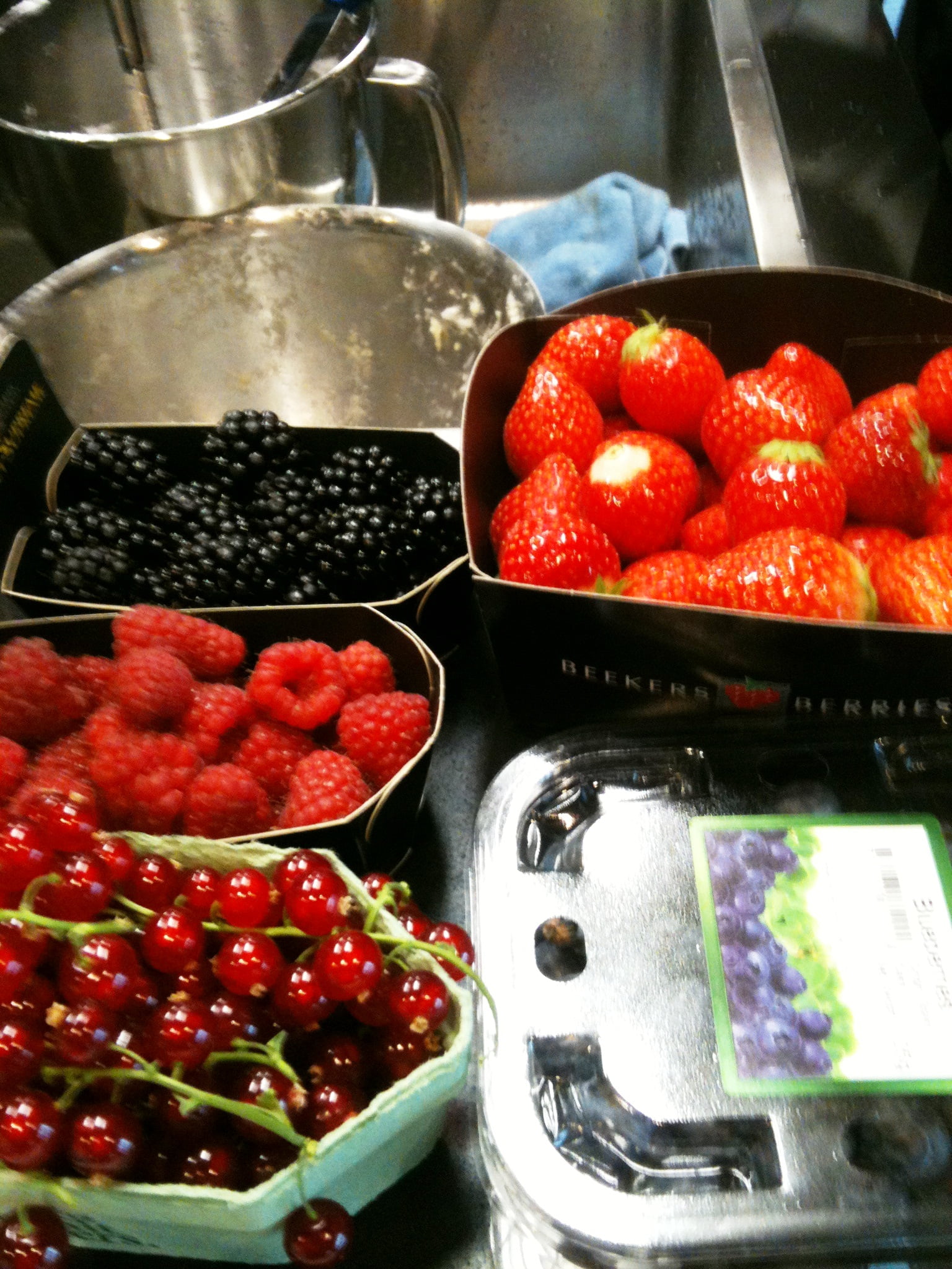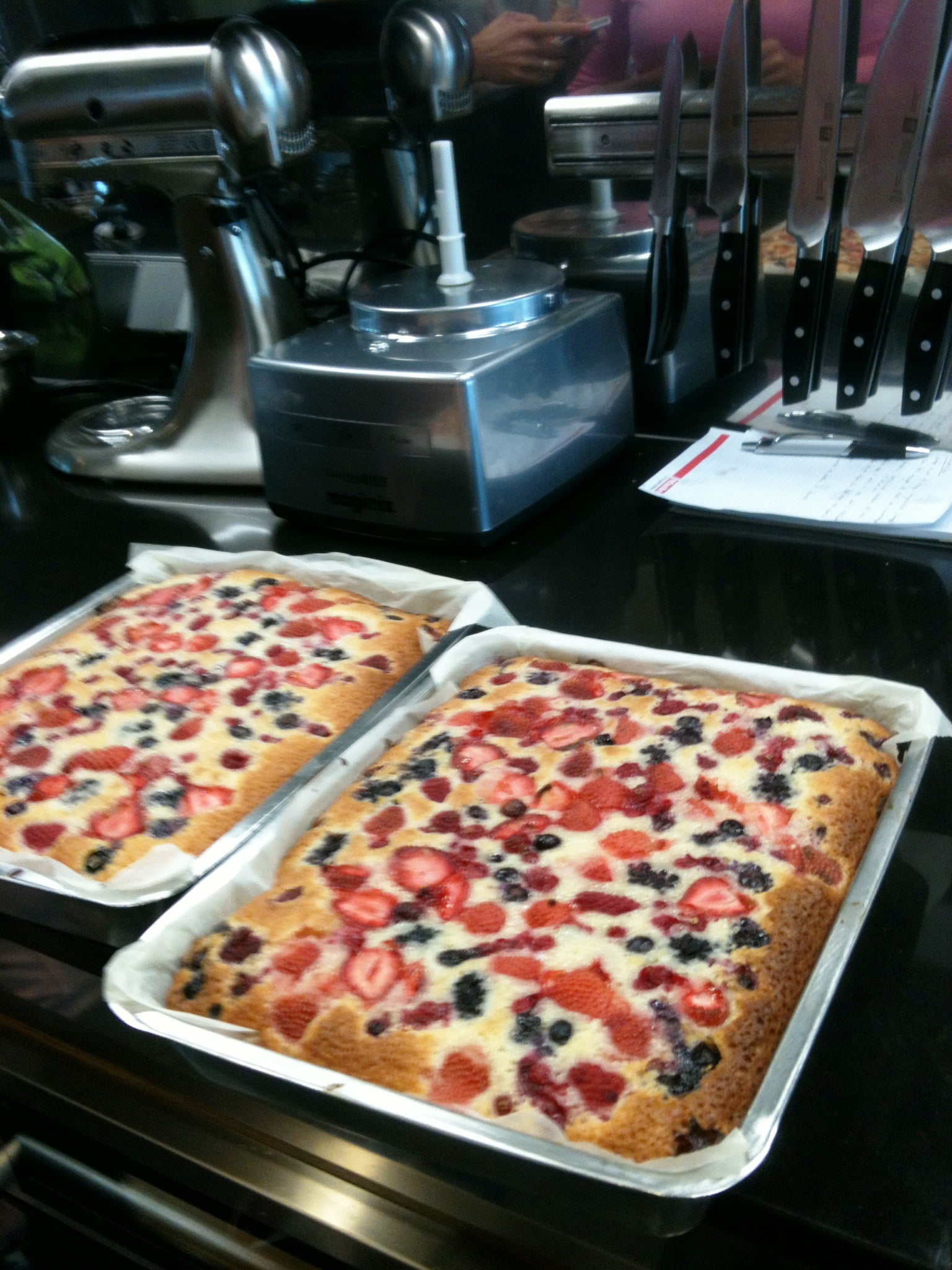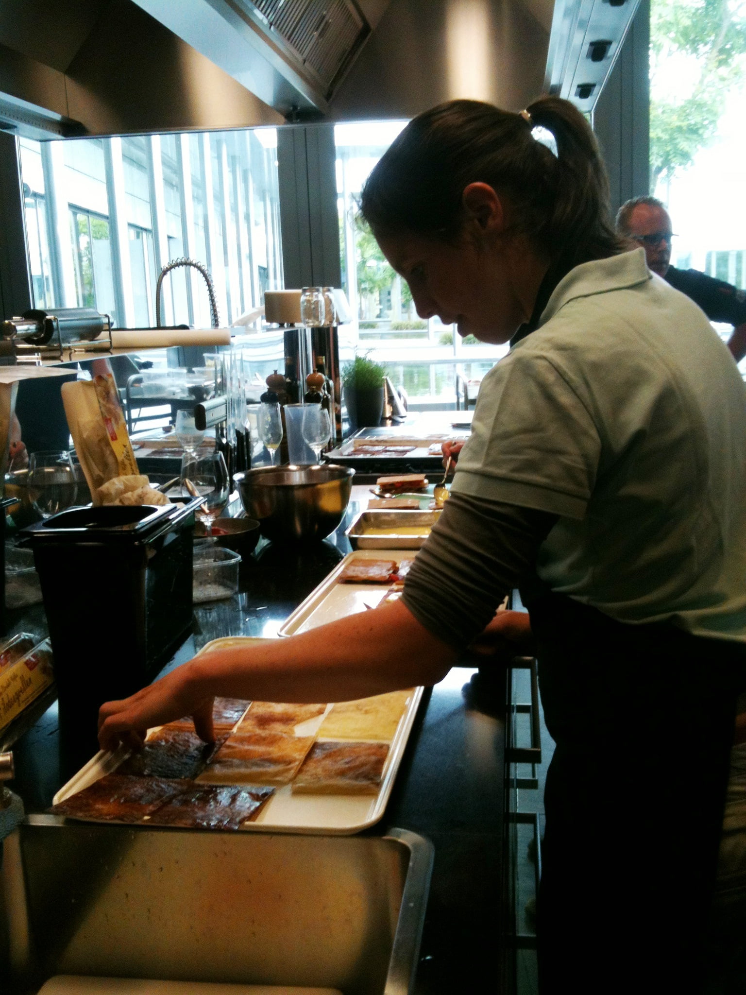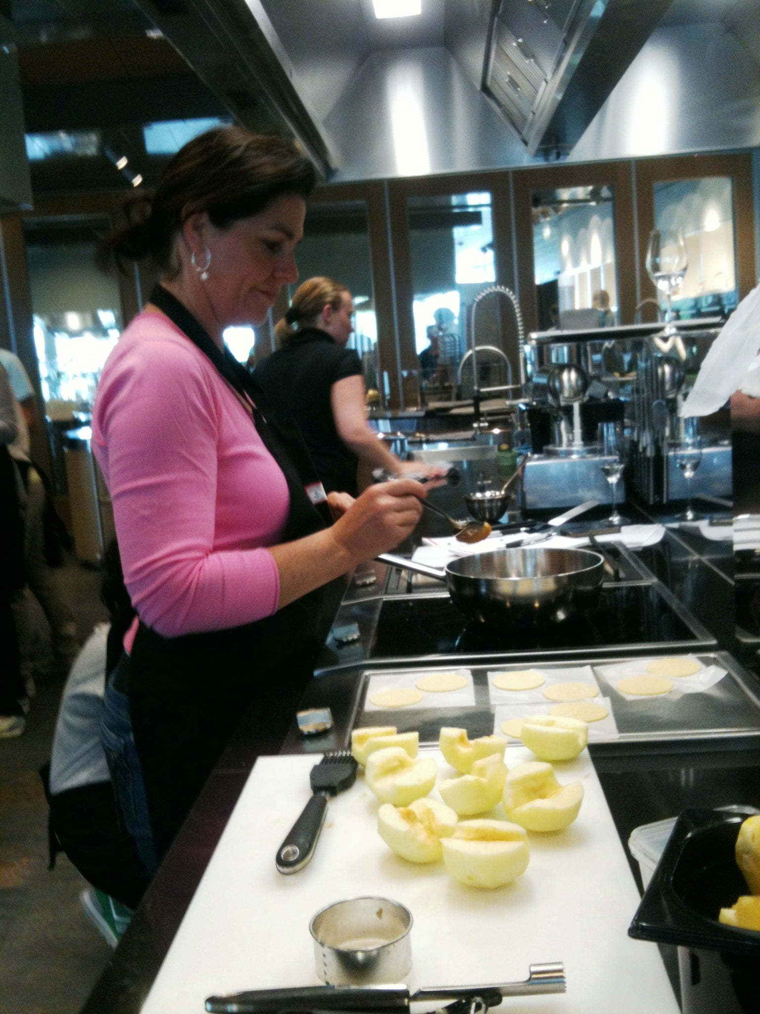 Laura: ‘Direct na de koffie willen de deelnemers aan de slag, want het lijkt lang zo’n dag bakken, maar tijd vliegt voor leergierigen. Efficiënt ingedeeld in groepen, in geweldig uitgeruste keukens, volgt de eerste uitleg. Mijn collega Marion gaat brood bakken en ik begin met ’n hartige bladerdeegtaart van asperges, courgette en basilicum. Het bladerdeeg is kant-en-klaar, dus kunnen we ons goed op de taartvulling storten. Een stoomoven is nu heel handig, want de groenten zijn snel bijna gaar en kunnen om en om in de bakvorm op het blind voorgebakken bladerdeeg. Met een mengsel van eieren, room en verse basilicum en veel peper gaat de taart nog een half uurtje de oven in. Afgekoeld geproefd mis ik nog wat zouts als spek of ansjovis, maar het is een leuk basisrecept. Dan volgen van Tante Fanny bladerdeeg tussendoor nog kaasvlinders en zoete kaneelkoekjes en maken de bakburen een oosterse kippastei en – heel lekkere – millefeuille van krokant filodeeg met rood fruit en citroentijm-crème die er royaal uitziet door de meerdere laagjes. We vergelijken de resultaten (lachend hoor, want dit is gelukkig géén wedstrijd!), proeven elkaars baksels en delen de technieken.’