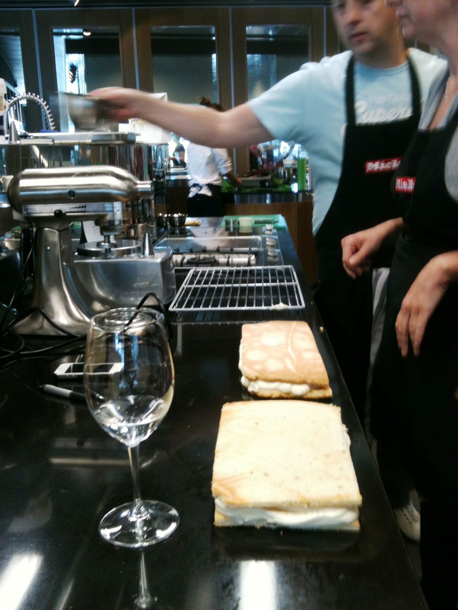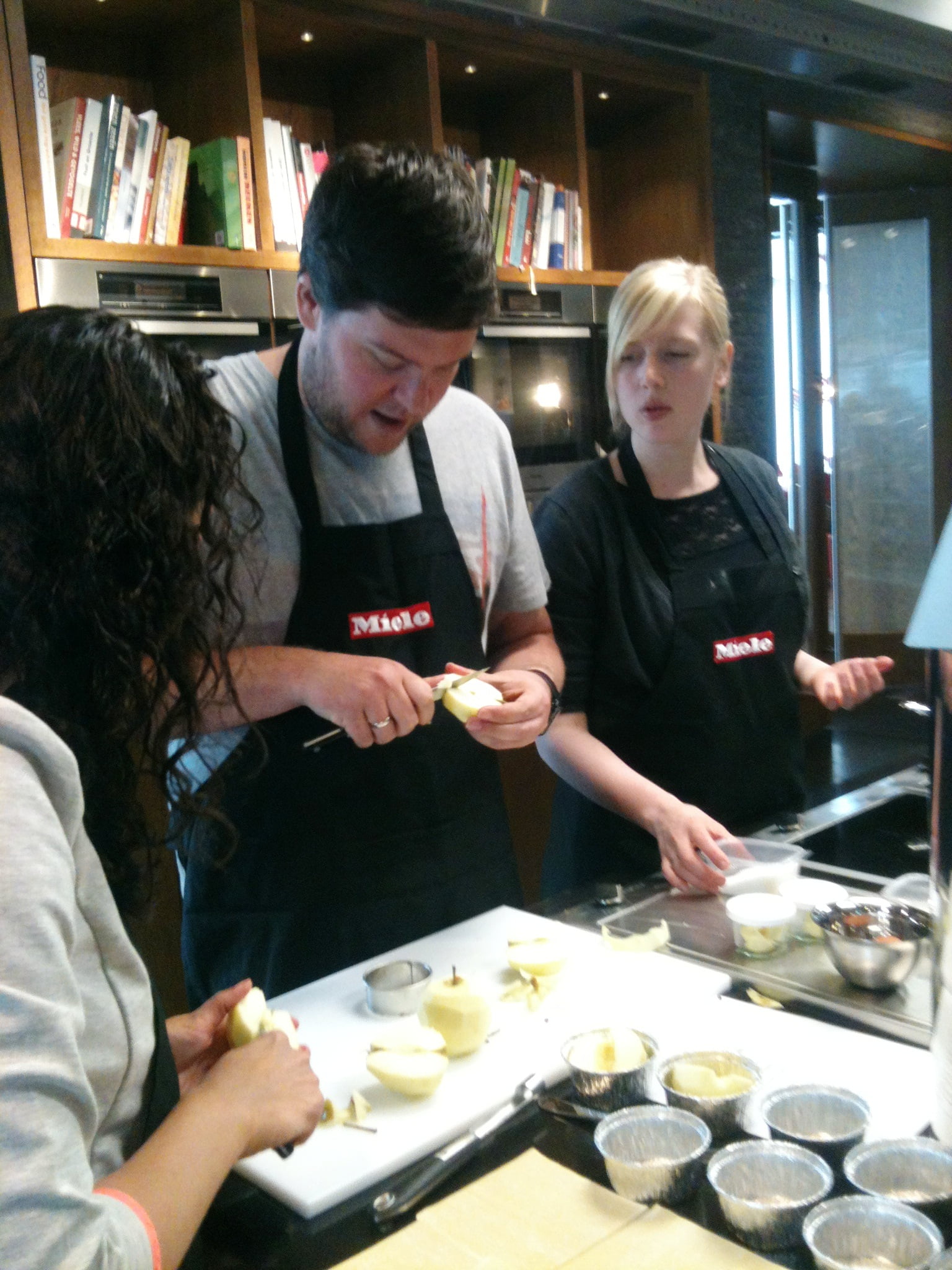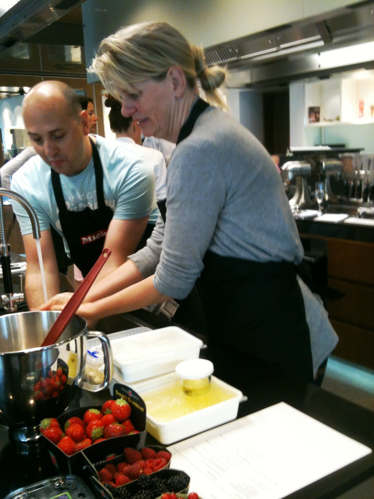 Laura: ‘Hidde den Brabander is de rust zelve na die twee adhd-broodbakkers! Patissiers werken vooral heel secuur. Niet een handje van dit of dat, maar exact afgewogen ingrediënten is de sleutel tot succes. En dat niet alleen, patissiers werken ook heel netjes en schoon. Wij maken biscuit de financier van amandelschaafsel dat we eerst tot poeder hebben gemalen, mengen het met 625 gram eiwit en 750 gram suiker en voegen 675 gram gesmolten boter en honing toe. En spatelen dan de bloem erdoor. Die had gezeefd moeten zijn, dus wij krijgen klontjes én veel werk om die er weer uit te krijgen. Het amandelmengsel gaat over een laagje harde wener deeg in de heteluchtoven en verspreidt snel een heerlijke geur. Afgekoeld gaat er abrikozenjam over en versieren we hem met rood fruit. Pas thuis proef ik dit gebak echt goed en ben onder de indruk van mijn eigen bakkunst … zo’n rijke en volle amandelsmaak heb ik lang niet gegeten! Samen met onze bakburen maken we nog miserable, weer van eiwit, suiker en amandelpoeder, maar nu met een botercrème met banketbakkersroom. Ik ben volkomen verzadigd, maar de mini-tarte tatin staat nog op het programma… die maken we ook nog samen, ons tempo is eruit, maar we laten ons niet kennen voor dit laatste onderdeel van het delicious.bakweekend! We drinken nog een glas en verdelen alle baksels die in dozen en zakjes – soms nog warm – mee naar huis gaan. Om het thuisfront én de redactie blij mee te maken… Een soort veldslag is het, zo’n vol bakprogramma, al zien de keukens er na afloop weer prachtig uit dankzij de Miele-opruimploeg. Volgend jaar gaan we absoluut weer, het is leerzaam en verrukkelijk (en dan te bedenken dat er mensen zijn die zaterdag én zondag zijn gegaan)!’