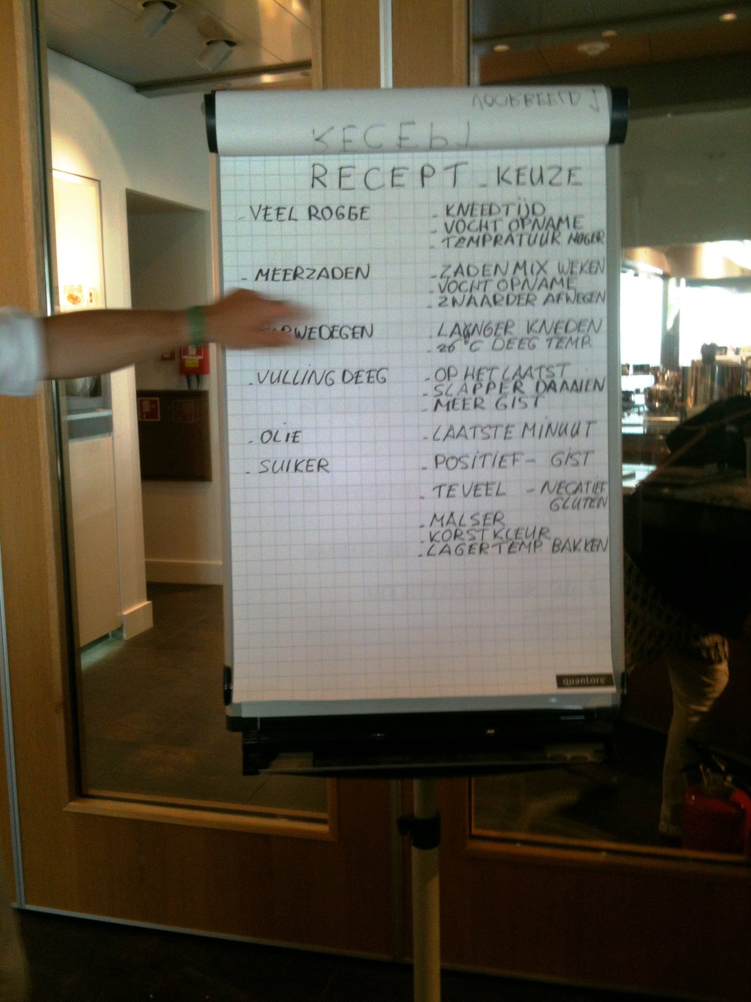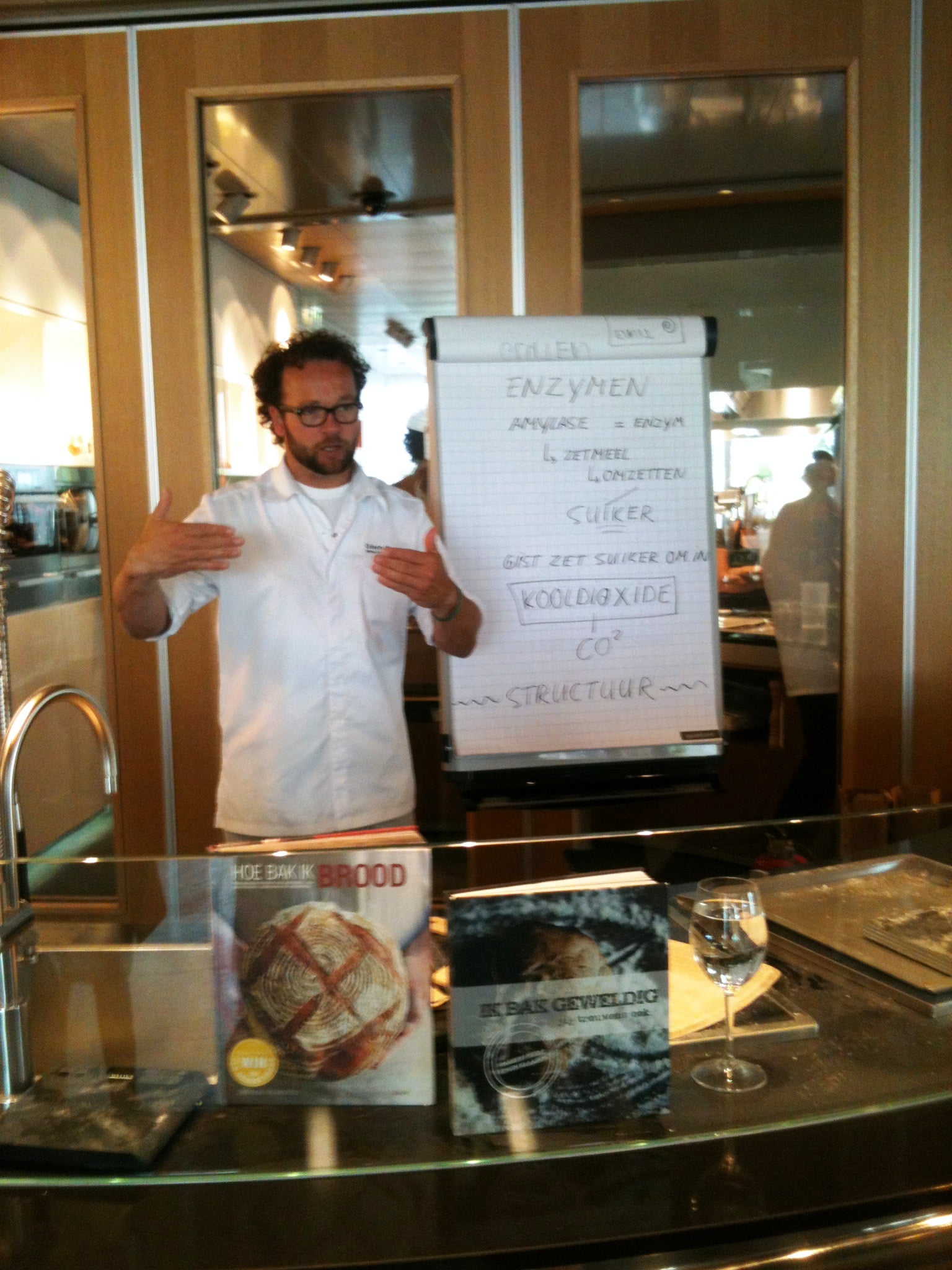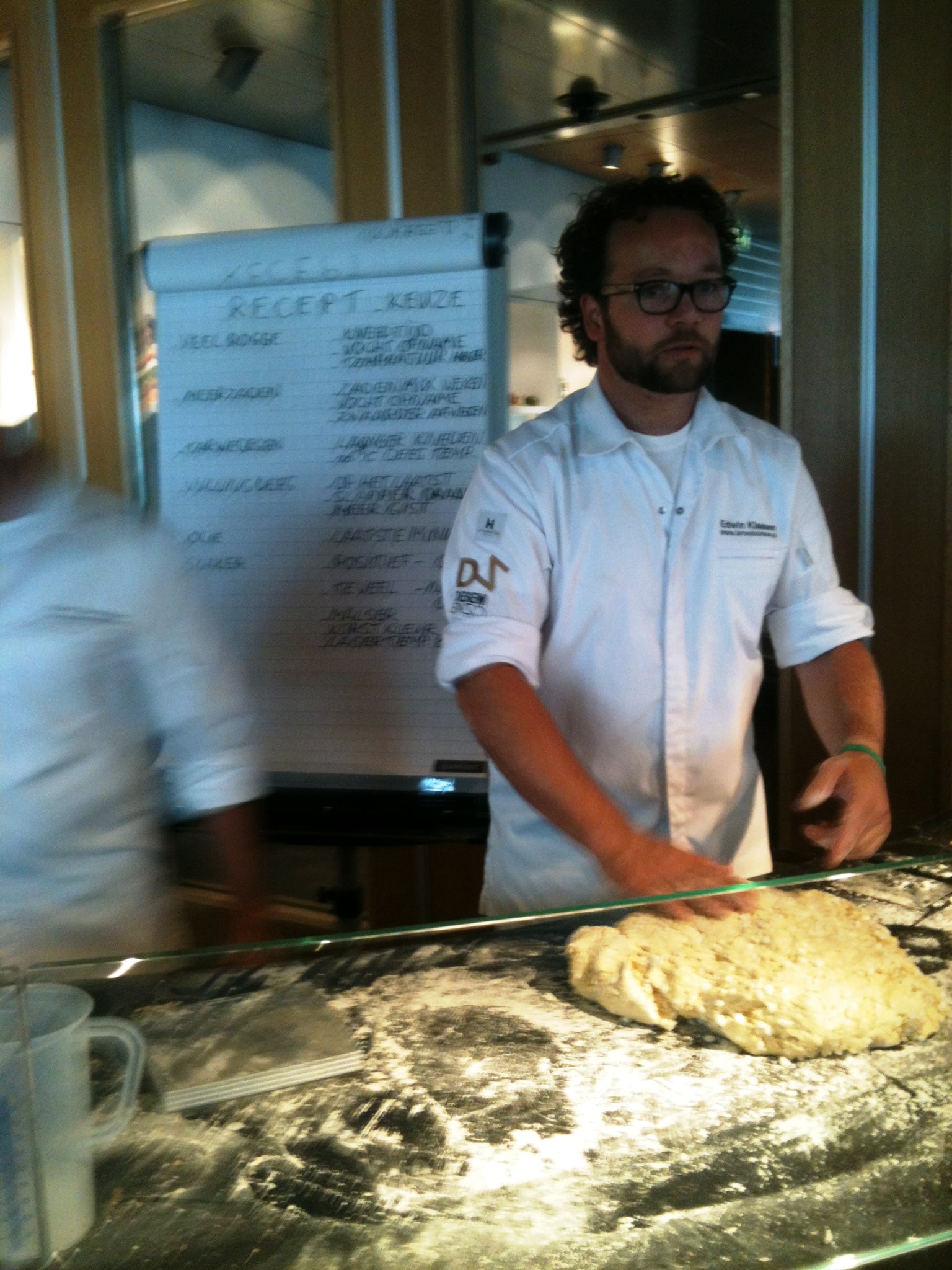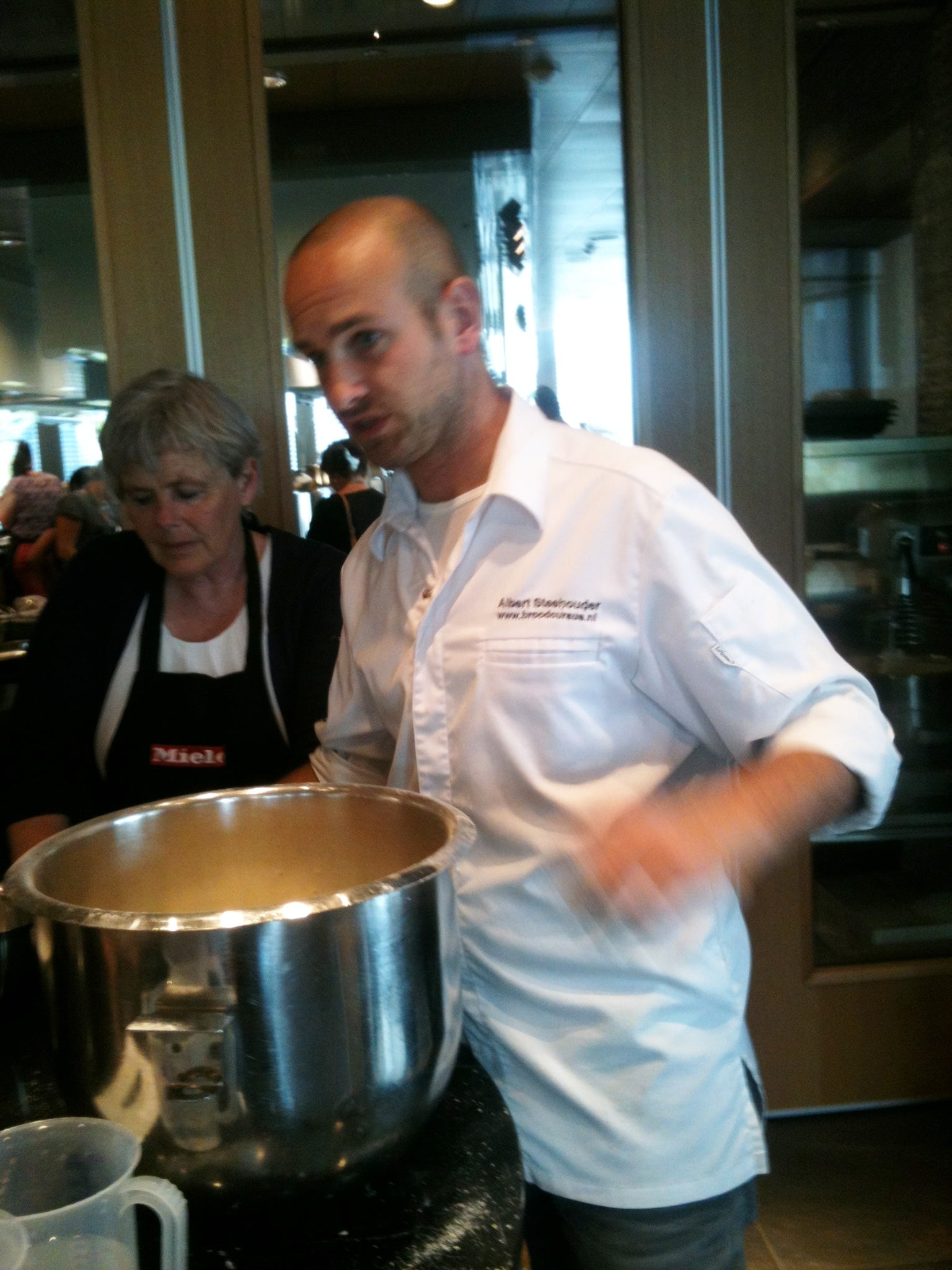 Laura: ‘Tussendoor is even tijd voor wat sap of koffie, maar al snel volgt een nieuwe bakronde. Wie nog niet zo’n bakweekend meemaakte: doe geen hakken aan maar verende gympen, want je loopt en staat de hele dag. Marion filmt enthousiast de sessie van de bakkers Edwin Klaasen en Albert Steehouder, die alles uit de doeken doen over goed brood bakken. Na de lunch begin ik ’s middags zelf aan het brood en merk dat de theorie niet mals is. Het tempo van Edwin zeker ook niet, maar met hulp van een flipover zet hij zijn mini-broodcursus voor ons op papier. Ik leer dat vooral de temperatuur van brooddeeg heel nauw steekt, 27 graden moet het blijven, maar daar leert deze bakker ons foefjes voor! Rijzen kan in een stoomoven of zelfs in een lege vaatwasmachine of wasdroger! En kneden met extra toevoeging van bloem is uit den boze, voeg liever niets toe, alleen als het nodig is een beetje roggemeel. We maken vijgen-walnotenbroodjes met desem en gist, een heus suikerbrood met boter en grove suikermix door het deeg en een Italiaans wit met olijfolie dat we leren vlechten of waar we een plukbrood van maken. Vooral het kneden is heel hard werken in het tempo van deze professionele bakkers, maar gelukkig gooien ze er ook wat keiharde grappen tussendoor, zodat je weer weet dat je dit voor je plezier doet. Met rode konen van inspanning en zwarte schorten die nu meer wit zijn, gaan we naar de volgende ronde, die van de patisserie.’