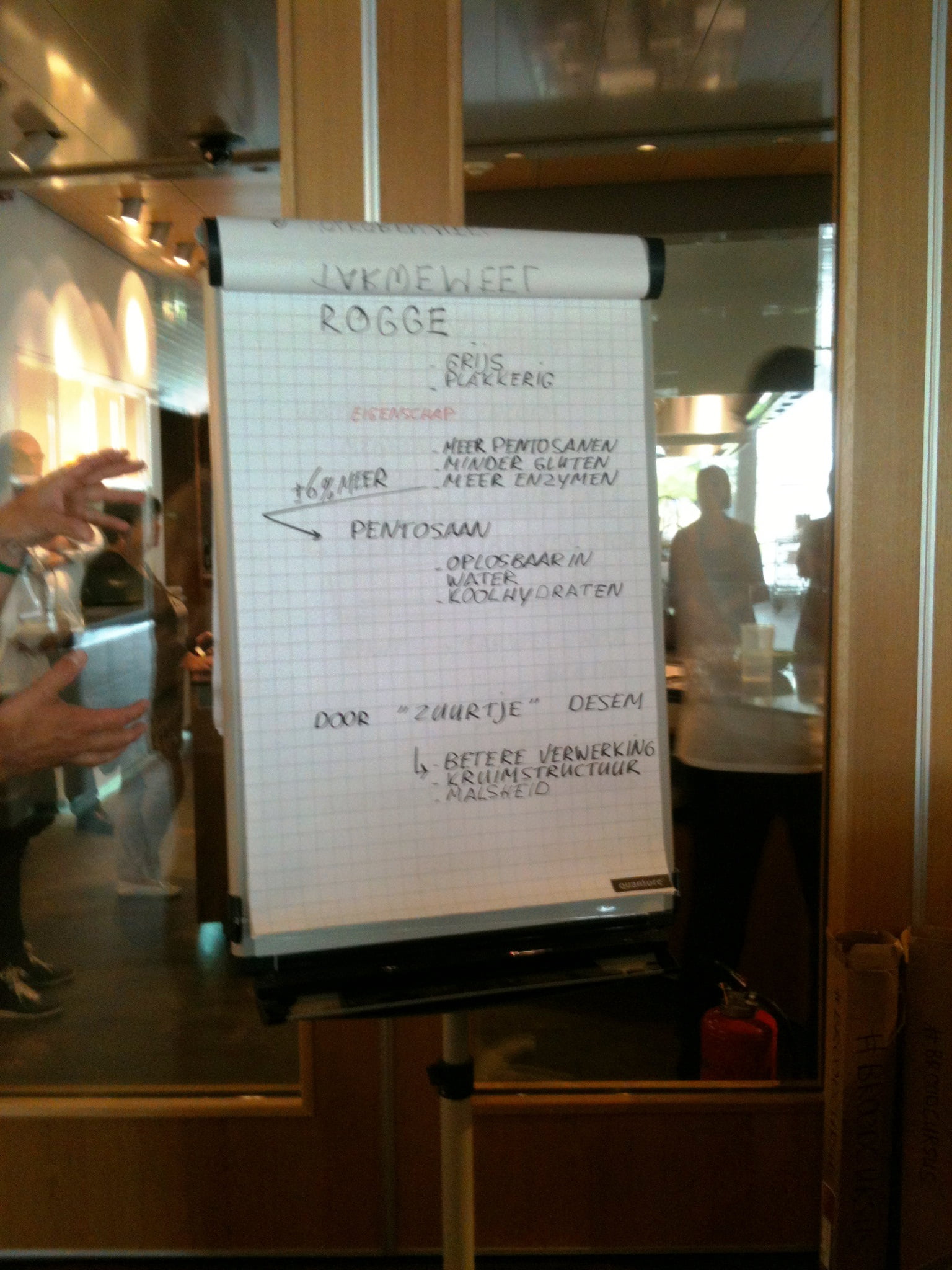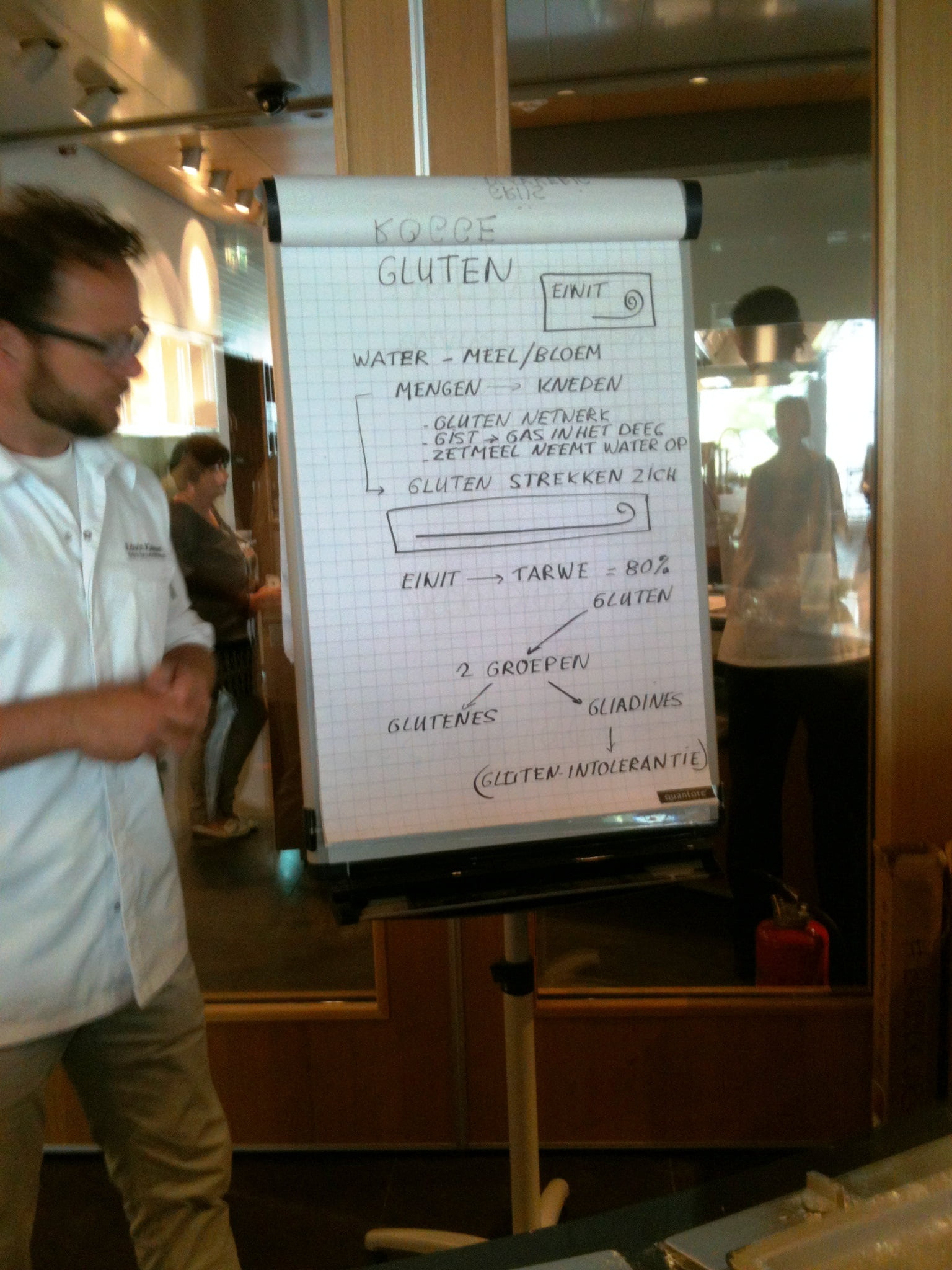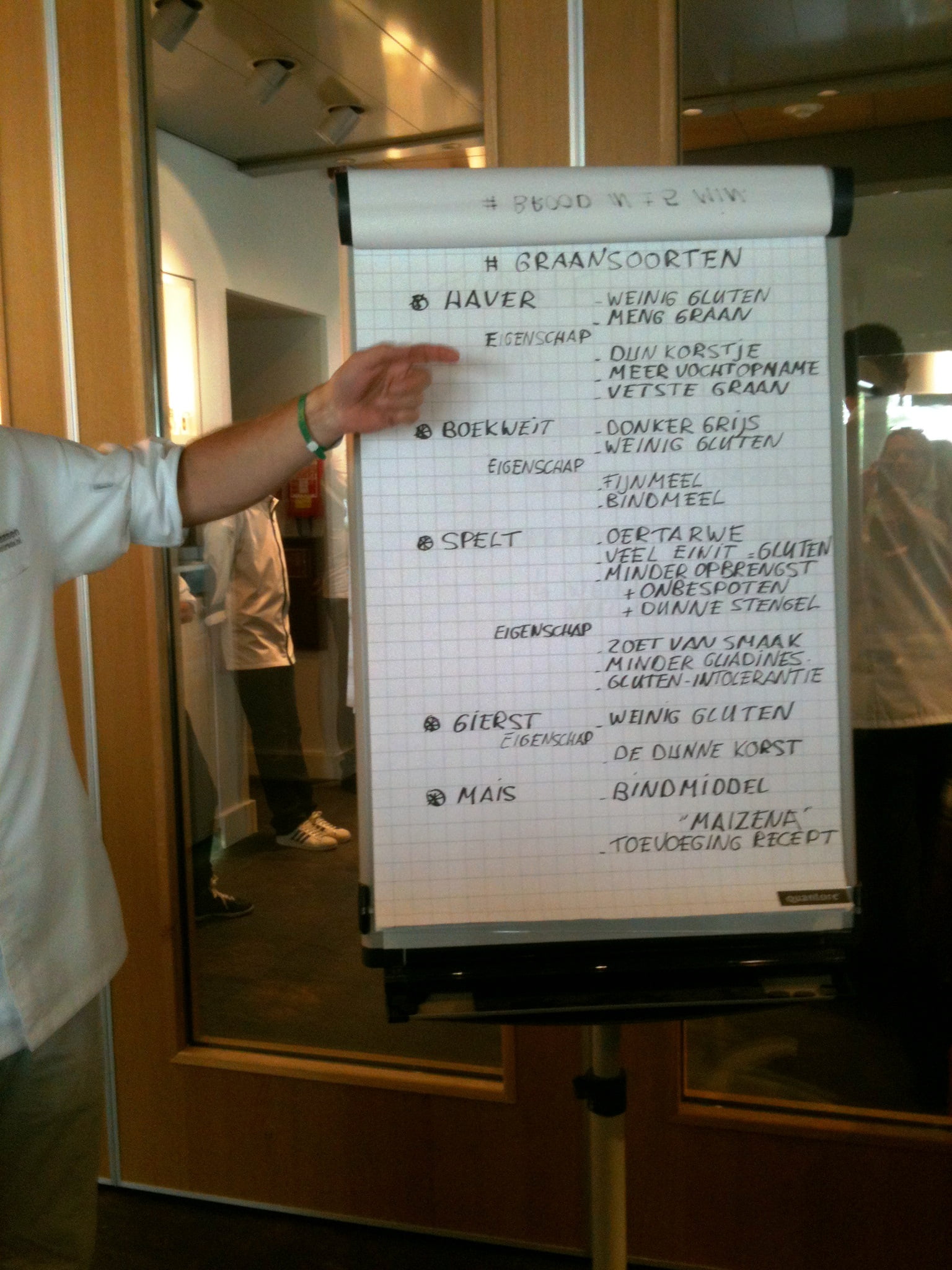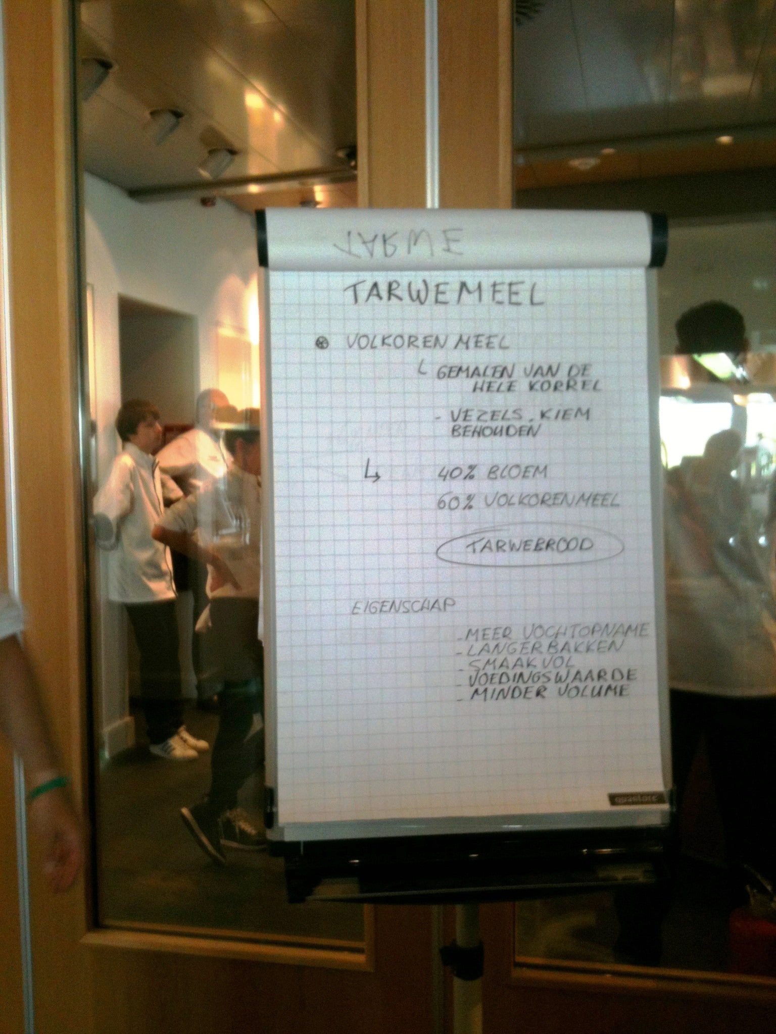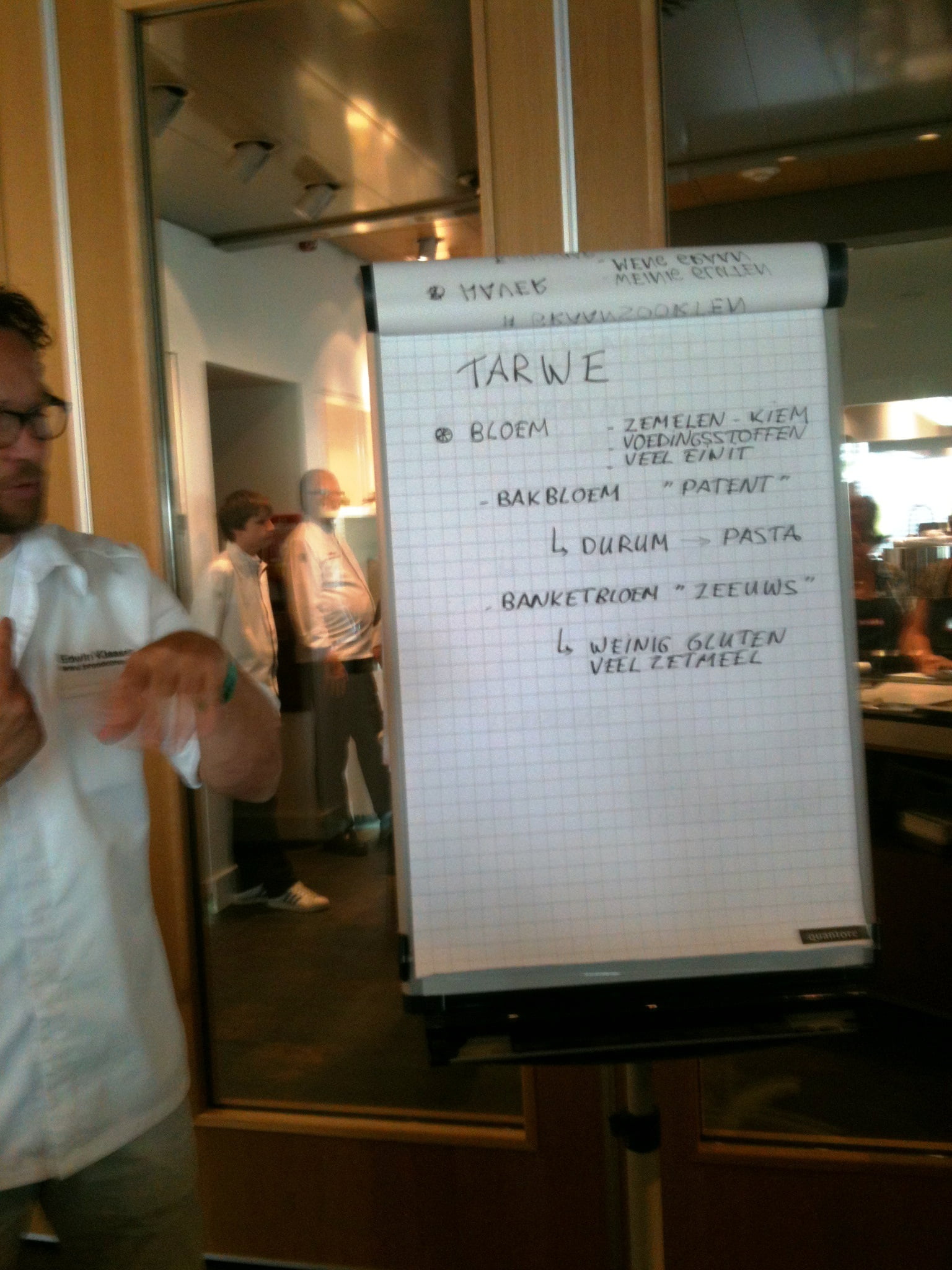 Laura: ‘Tussendoor is even tijd voor wat sap of koffie, maar al snel volgt een nieuwe bakronde. Wie nog niet zo’n bakweekend meemaakte: doe geen hakken aan maar verende gympen, want je loopt en staat de hele dag. Marion filmt enthousiast de sessie van de bakkers Edwin Klaasen en Albert Steehouder, die alles uit de doeken doen over goed brood bakken. Na de lunch begin ik ’s middags zelf aan het brood en merk dat de theorie niet mals is. Het tempo van Edwin zeker ook niet, maar met hulp van een flipover zet hij zijn mini-broodcursus voor ons op papier. Ik leer dat vooral de temperatuur van brooddeeg heel nauw steekt, 27 graden moet het blijven, maar daar leert deze bakker ons foefjes voor! Rijzen kan in een stoomoven of zelfs in een lege vaatwasmachine of wasdroger! En kneden met extra toevoeging van bloem is uit den boze, voeg liever niets toe, alleen als het nodig is een beetje roggemeel. We maken vijgen-walnotenbroodjes met desem en gist, een heus suikerbrood met boter en grove suikermix door het deeg en een Italiaans wit met olijfolie dat we leren vlechten of waar we een plukbrood van maken. Vooral het kneden is heel hard werken in het tempo van deze professionele bakkers, maar gelukkig gooien ze er ook wat keiharde grappen tussendoor, zodat je weer weet dat je dit voor je plezier doet. Met rode konen van inspanning en zwarte schorten die nu meer wit zijn, gaan we naar de volgende ronde, die van de patisserie.’