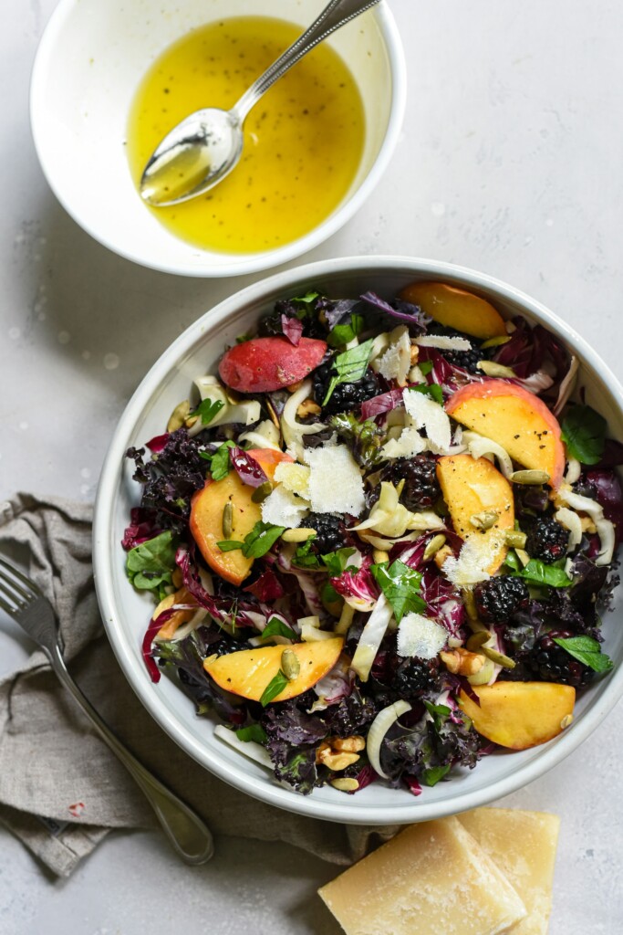 Voor de olie kies je het beste een neutrale olie, zoals zonnebloemolie. Olijfolie kan soms een bittere nasmaak geven, zeker bij een delicate salade. Wil je de vinaigrette extra romig maken? Klop er dan op het einde een eidooier doorheen. Dat maakt de dressing voller en bindt hem prachtig.