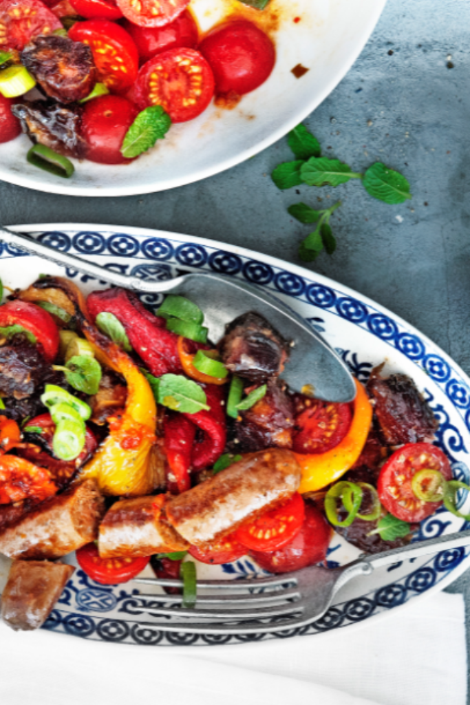 KLIK MET Spaanse bonensalade met garnalen, en chorizo (pag. 43 delicious. nummer 6), geroosterde-paprikasalade met dadels en merguez (pag. 43 delicious. nummer 6).