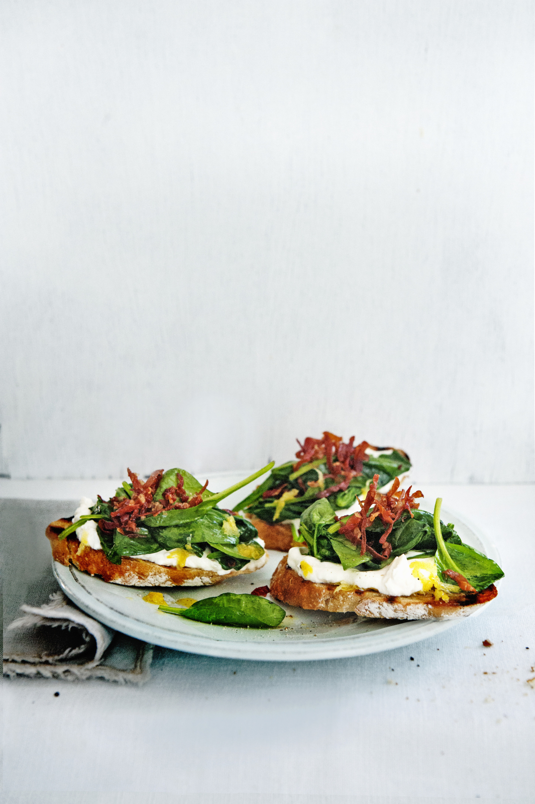 Verhit in de koekenpan de resterende 2 el olijfolie. Snijd de laatste knoflookteen fijn en fruit met de ansjovisfilet 2 min. zachtjes. Schep de spinazie erdoor en bak tot het blad begint te slinken. Verdeel de helft van de overgebleven ricotta-mascarponecrème met de spinazie over de bruschette. Leg ze op een schaal. Bestrooi met de krokante reepjes parmaham en besprenkel eventueel met nog wat extra citroenolie.
