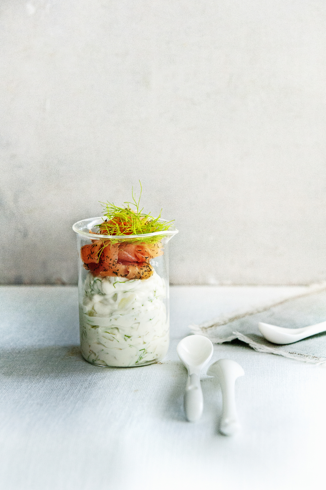 Houd het venkelgroen apart en snijd de rest van de venkel zo fijn mogelijk. Schep de venkel door de rest van de ricotta-mascarponecrème. Breng op smaak met peper en schep in 4 kleine (borrel)glaasjes. Garneer met de zalm, het apart gehouden venkelgroen en peper naar smaak.