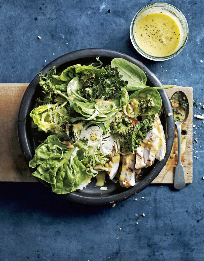 Bestrijk de kipfilets met olie en bestrooi ze met zout en peper. Verhit een grillplaat of barbecue op hoog vuur en gril 2-3 min. aan elke kant of tot ze gaar zijn. Snijd de kip in plakken en leg ze in een grote kom. Voeg sla, spruitjes, spinazie en pijnboompitten toe en schep om. Verdeel de caesarsalade over borden, maak af met krokante boerenkool en dressing en dien op.
