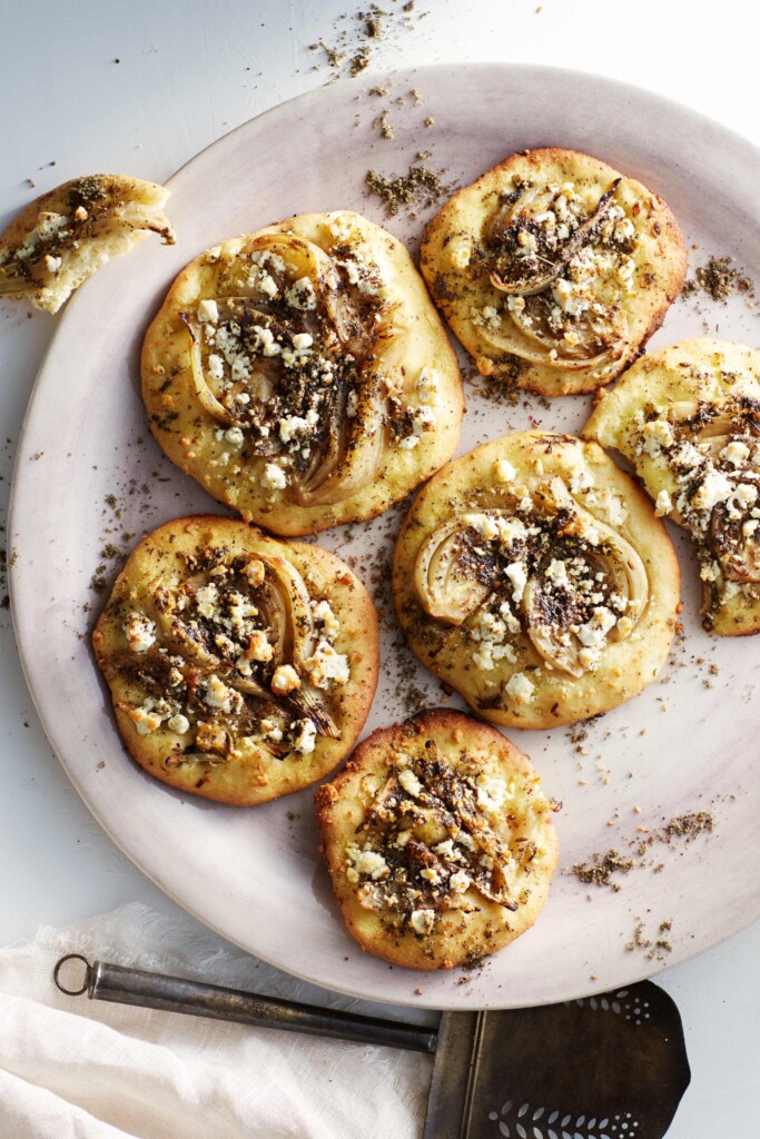 - Verdeel in 8 bolletjes. Druk ze plat tot kleine ronde niet te dunne pizza’s en rol ze een beetje uit op een royaal met bloem bestoven werkvlak. Leg ze op een bakplaat bekleed met bakpapier. Verdeel de venkel en knoflook over de pizza’tjes met wat van de aanhangende olie. Verdeel ook de witte kaas erover. Bestrooi met 2 el za’atar en wat zout.