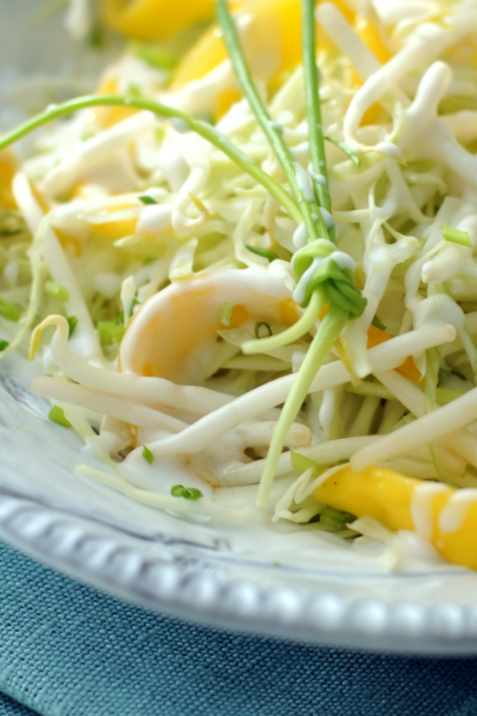 Overgiet de taugé in de zeef in de gootsteen met ruim (1½-2 liter) kokend water en spoel daarna koud en laat uitlekken. Meng de taugé luchtig met de rest van de ingrediënten en breng op smaak met versgemalen peper.