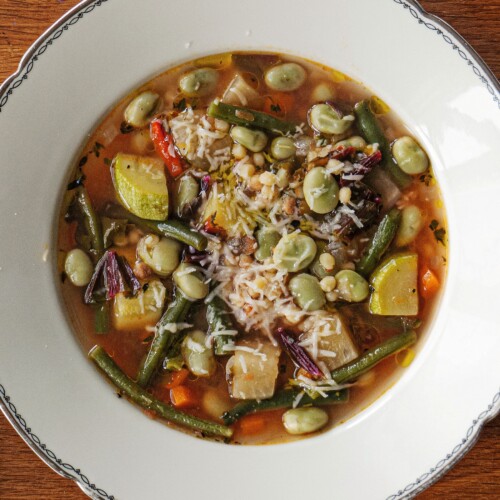naar receptTamara Ivanović: "Oma Mira studeerde Italiaans, werkte vijf jaar met Italianen in Libië en was groot liefhebber van de Italiaanse keuken. Ik leerde van haar brodo di verdure maken. Het klonk vele malen leuker dan ‘groentesoep’ en ze zette het creatief in om mij aan tafel te krijgen. Je zou het niet geloven, maar ooit moest ze achter me aan lopen, met de kom en de lepel in haar hand, zelfs de straat op, omdat ik spelen leuker vond dan eten. Jaren later kwam ik erachter dat dit recept technisch gezien geen brodo di verdure is, maar eerder verdure in brodo, of zelfs minestrone. Als je een stuk korst van parmigiano in de koelkast hebt liggen, kook die dan mee voor extra smaak."