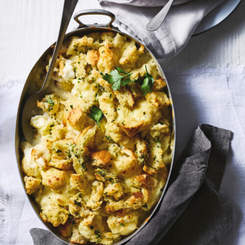 Van deze bloemkoolgratin met krokante knoflook blijft iedereen eten! Bloemkool in romige kaassaus met een krokante topping van knoflook, broodkruim en peterselie.
