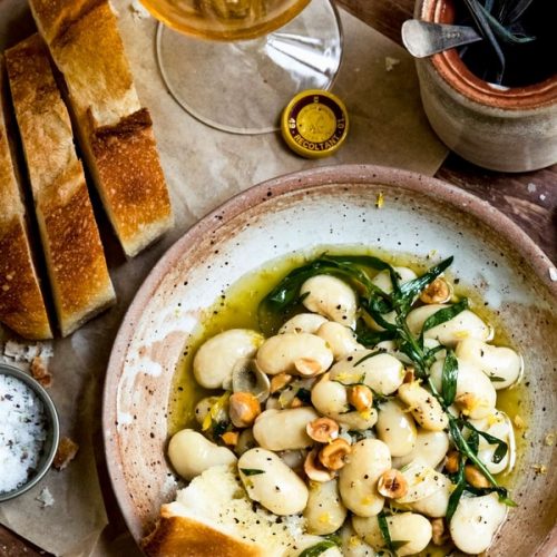 naar receptEen topwijn met een simpel hapje zijn vaak de mooiste combinaties! De hazelnootolie versterkt het notige in de wijn, de citroenschilletjes geven frisheid en de smeuïge limabonen met dragonolie maakt het tot één geheel.