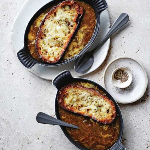 De wereldberoemde uiensoep met langzaam gekarameliseerde uien, bouillon, croutons en gesmolten kaas (meestal Gruyère of Comté). Daar kun je ons ’s nachts voor wakker maken.
