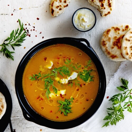 naar receptHoning, knoflook en chili zijn de smaakmakers in deze lentesoep met frisse gemberyoghurt & luchtige homemade minipita's.