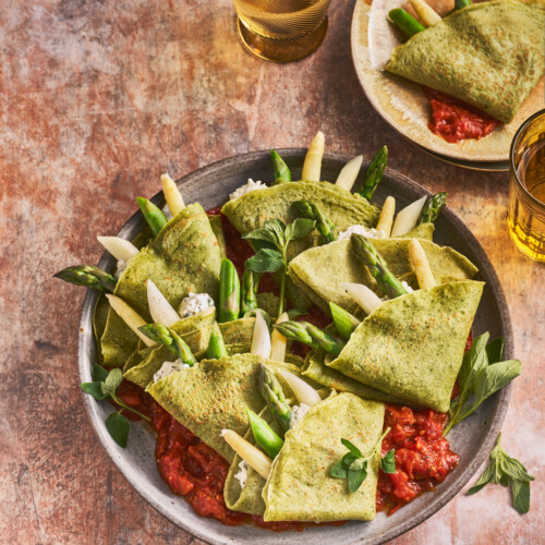 naar receptKruidige, groene flensjes die je vult met romige stracciatella en frisse asperges. De lichtpittige arrabbiatasaus brengt dit gerecht tot leven.