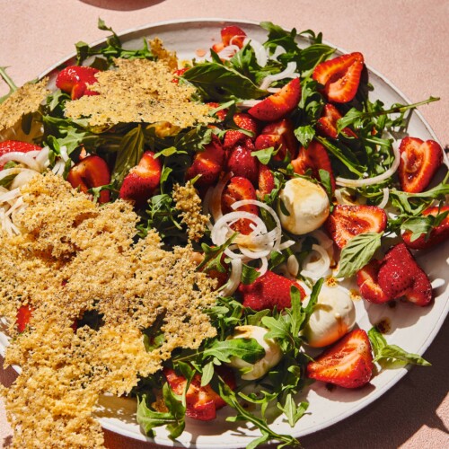 Salade-uien of bosuien, vaak verkocht met wat groen eraan, zijn mild maar als je ze niet kunt vinden, neem je rode ui.Als je de salade meeneemt, kun je kleinere parmezaancrackers maken: maak dan hoopjes van de geraspte kaas met tussenruimte en bewaar de crackers afgesloten in de kast, niet in de koelkast, tot je gaat eten. Kies de geurigste aardbeien voor extra zoetheid en laat ze maximaal 15 minuten intrekken.