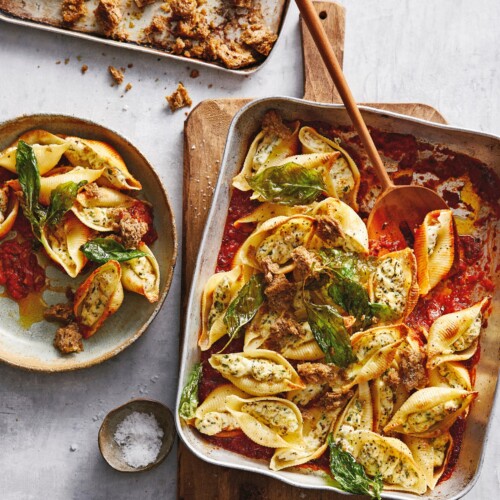 Grote pastaschelpen gevuld met een zijdezachte, romige ricotta-citroenvulling met gefrituurde basilicum. Even in de oven, waar de bovenkant goudbruin en krokant wordt, terwijl de binnenkant heerlijk smeuïg blijft. Echt zalig.