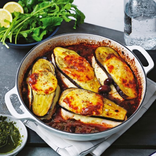 naar receptSmoor kip tussen dikke plakken aubergine en wacht tot de kaas is gesmolten en de suikers in de tomatensaus heerlijk zoet zijn gekaramelliseerd. Roep dan luid en hartstochtelijk 'aan tafel!', want deze eenpanner is in ruim een uurtje klaar.