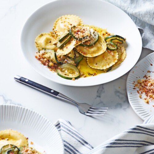 Verse ravioli met kaas van de deli is de basis, de rest is echt easy. Met salie, chilipeper en de pecorino-pangrattato maak je het hemels!