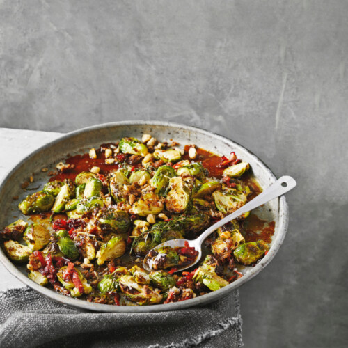naar receptEen extra tip: geroosterde spruitjes met bacon en appel zijn ook heerlijk als salade voor erbij. Laat afkoelen tot kamertemperatuur en hussel er 50 g rucola door. Breng de salade op smaak met extra vierge olijfolie en gerijpte balsamico-azijn.