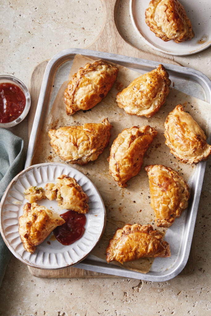 2. Steek met de uitsteker rondjes uit de plakjes bladerdeeg en leg op 2 met bakpapier beklede bakplaten. Schep wat van de vulling op de ene helft van een bladerdeegrondje, maar laat een rand van 1½ cm vrij. Bestrijk de rand met ei, vouw de andere helft erover en duw goed aan om de rand te sluiten. Gebruik een vork om de randen te versieren en maak er zo nog 11.