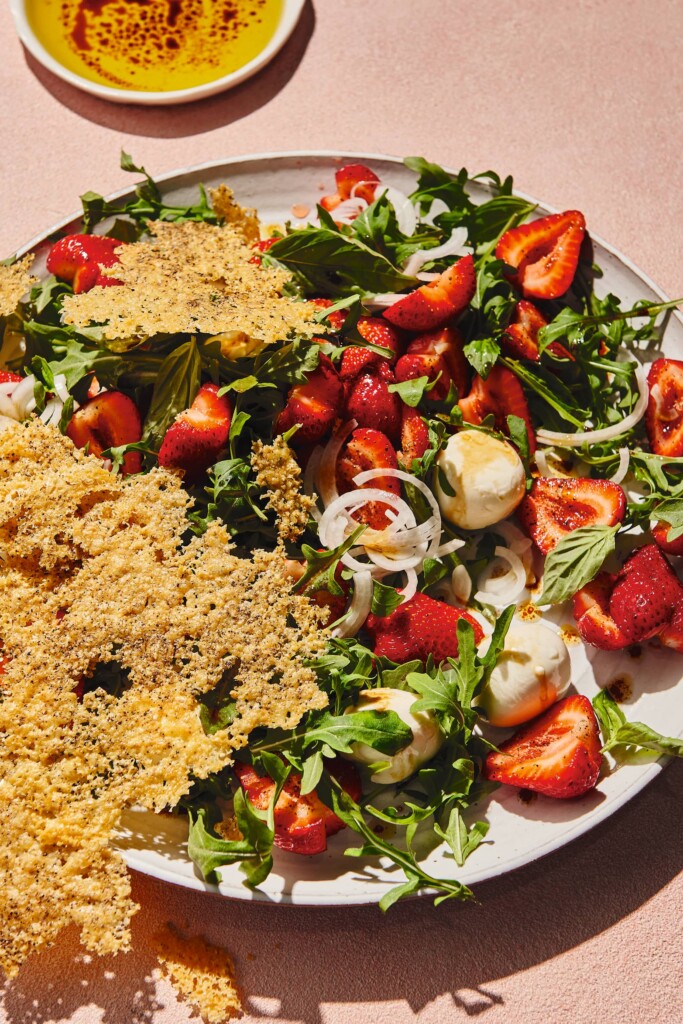 - Stel de salade samen: laat de rucola en basilicum uitlekken en droog ze. Meng met de aardbeien, leg op een schaal en verdeel de mozzarella en bosui erover.